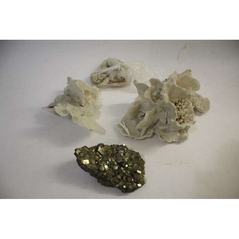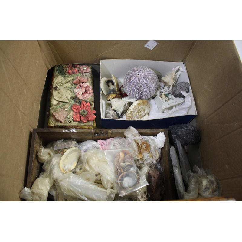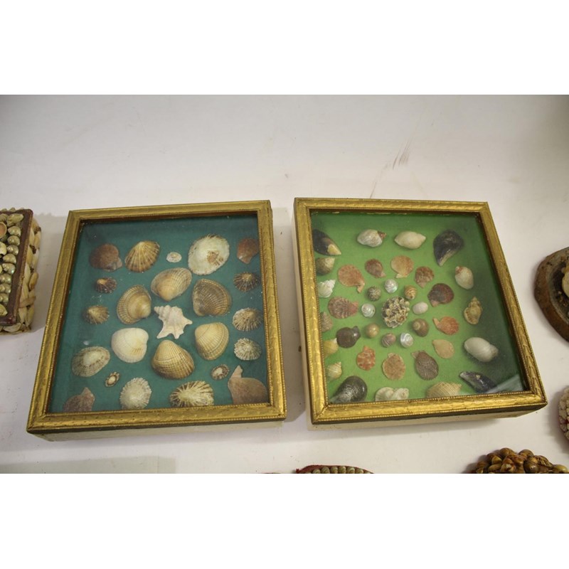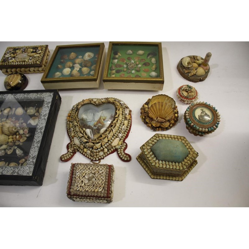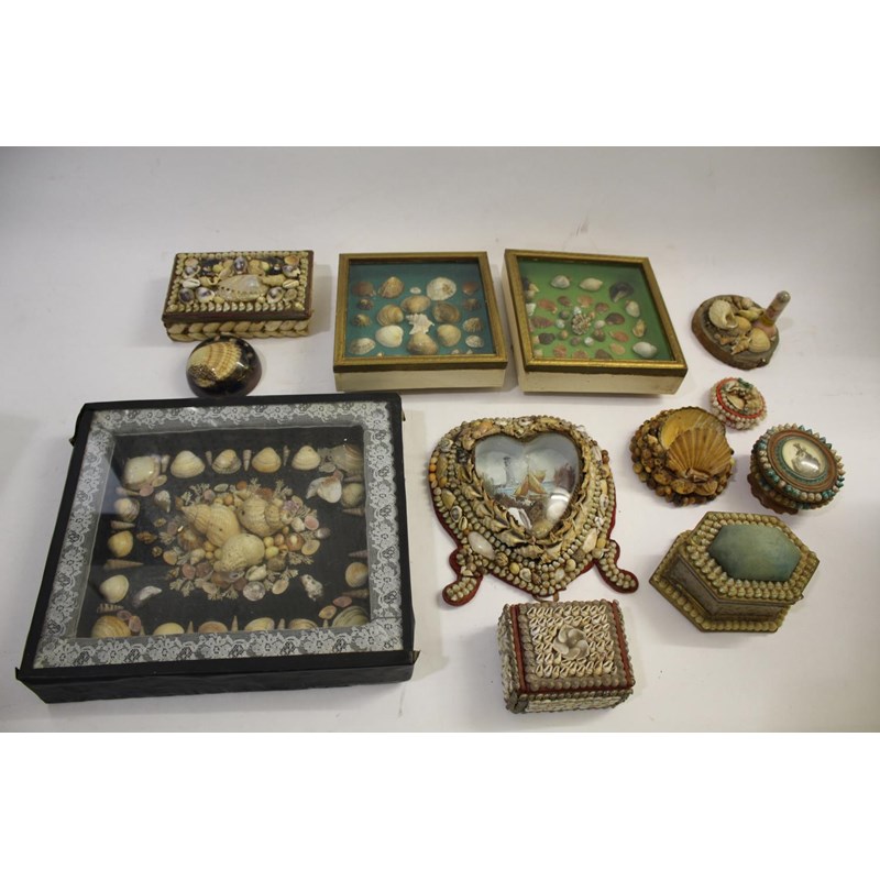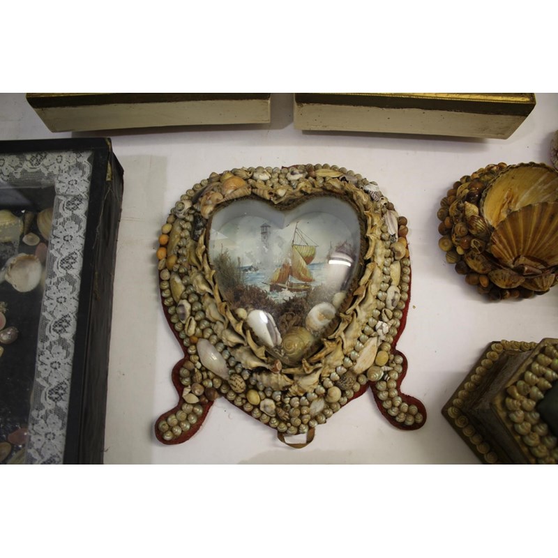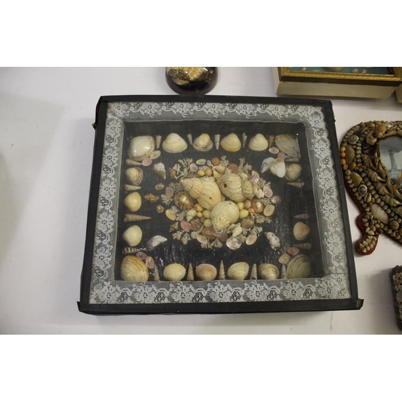 a mixed lot including a heart shaped shell valentine (22cms by 20cms), a rectangular case with a lace border and various shells to the centre (33cms by 29cms), two small glazed cases with various shells, and various shell boxes and other souvenirs. Also with various loose shells, fossils etc.