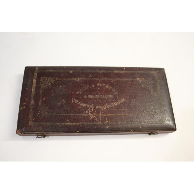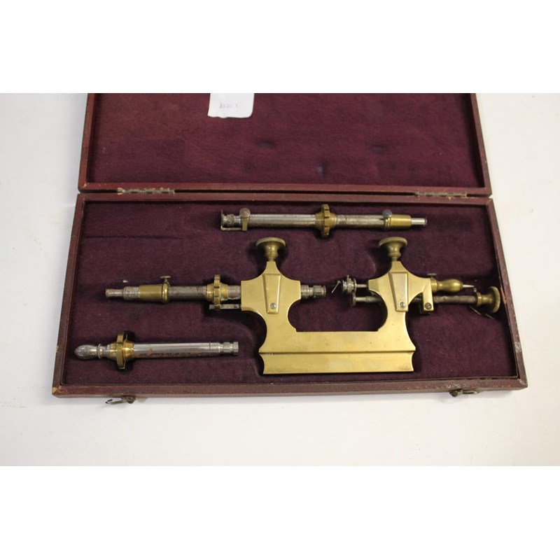 a brass and metal lathe in a fitted box with velvet lined interior, marked to the lid Tour A Pivotor, A vis de rappel, qualite superieure. Box 27cms across
