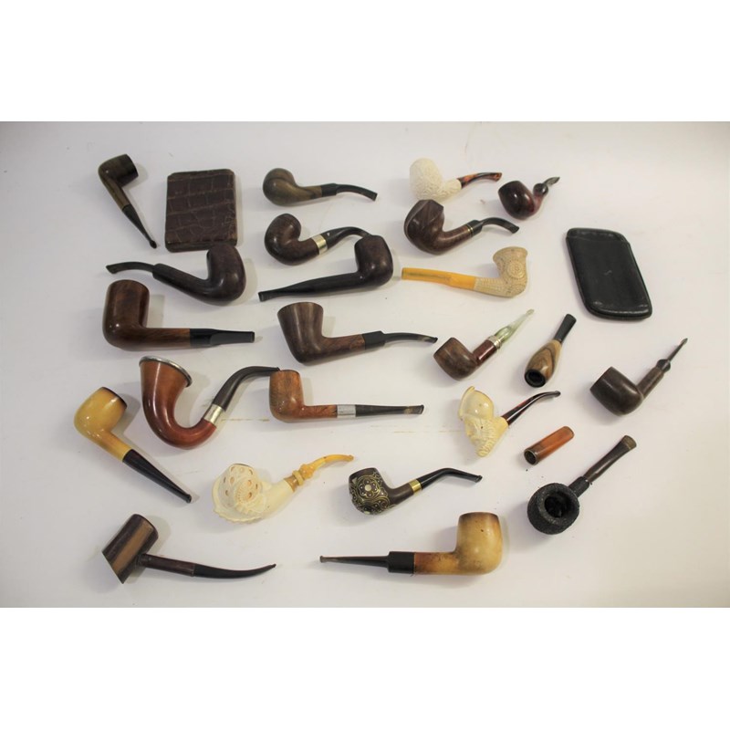 various pipes including Best Calabash pipe with silver rim and collar, Peterson Calabash with silver collar, Meerschaum pipes, Grandmaster (Malta), Lorenzo Titano, St Claude Terminus, etc. Also with a crocodile skin cigar case and leather case.