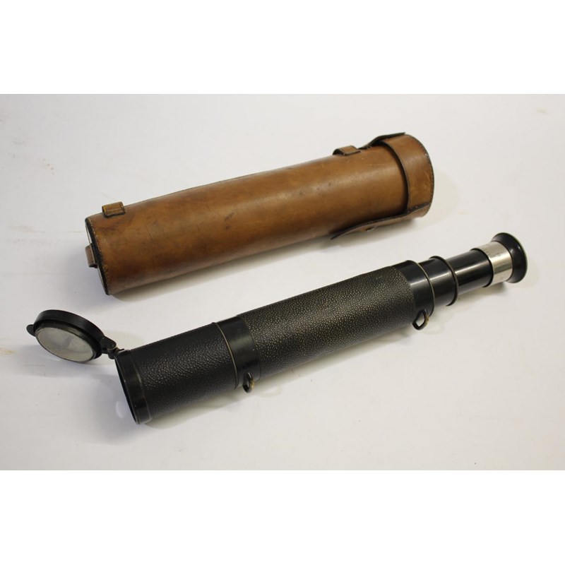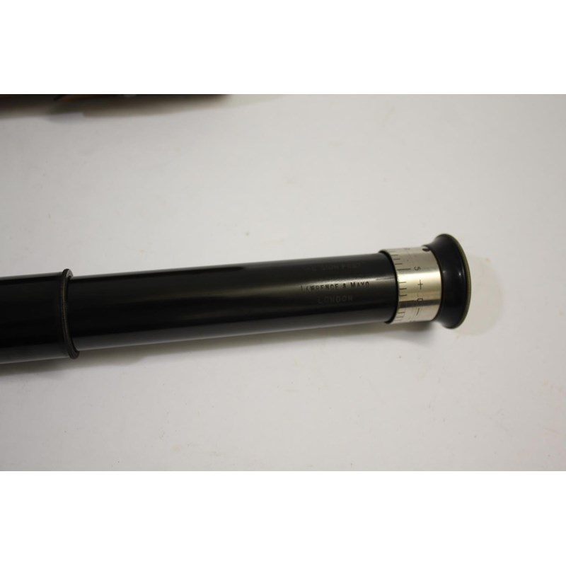 an unusual three drawer telescope, the hinged end with a compass inside. Marked, Lawrence & Mayo, Chancery Lane, London on the compass, and marked on the telescope The Sign Post. In a fitted leather case, 76cms long fully extended