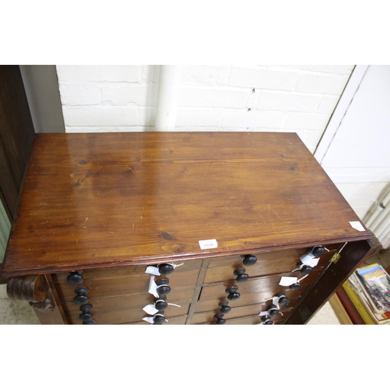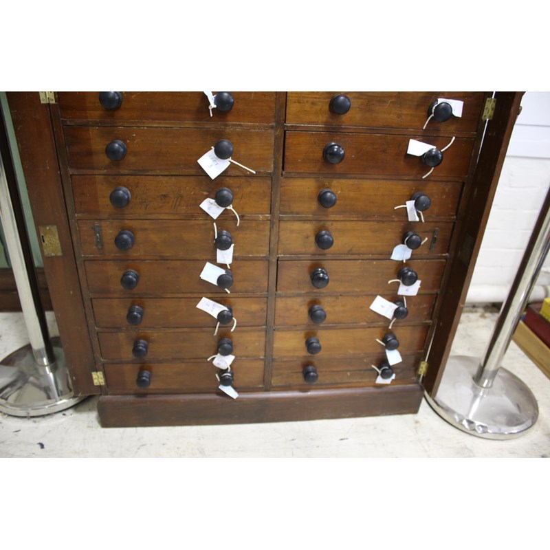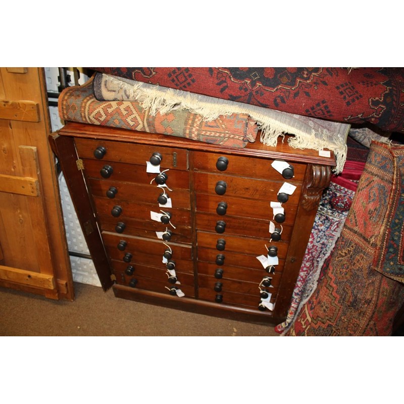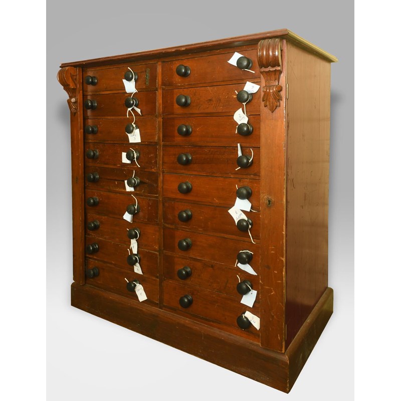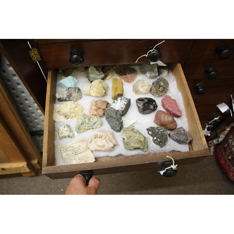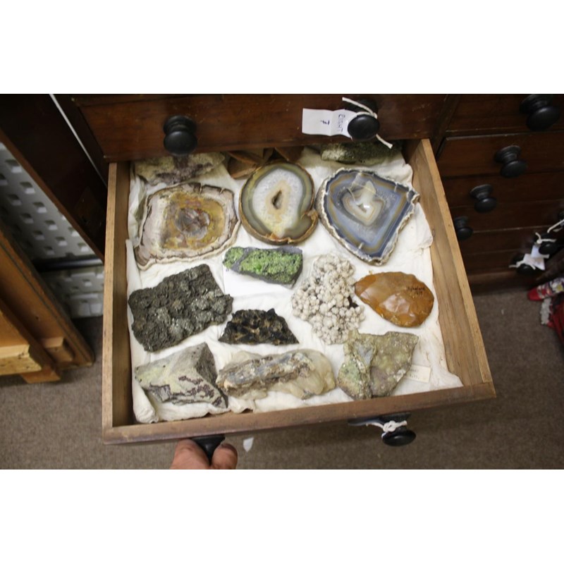 a large 18 drawer collectors cabinet with turned wooden handles, with a large qty of geological samples and fossils including pyrite, slag glass, nepheline, ammonites, flint hand axe (Aylesford 1899), agates, malachite, quartz, amethyst, and many more. Many with associated notes, and with a note book with various information. Cabinet 92cms high, 82cms across