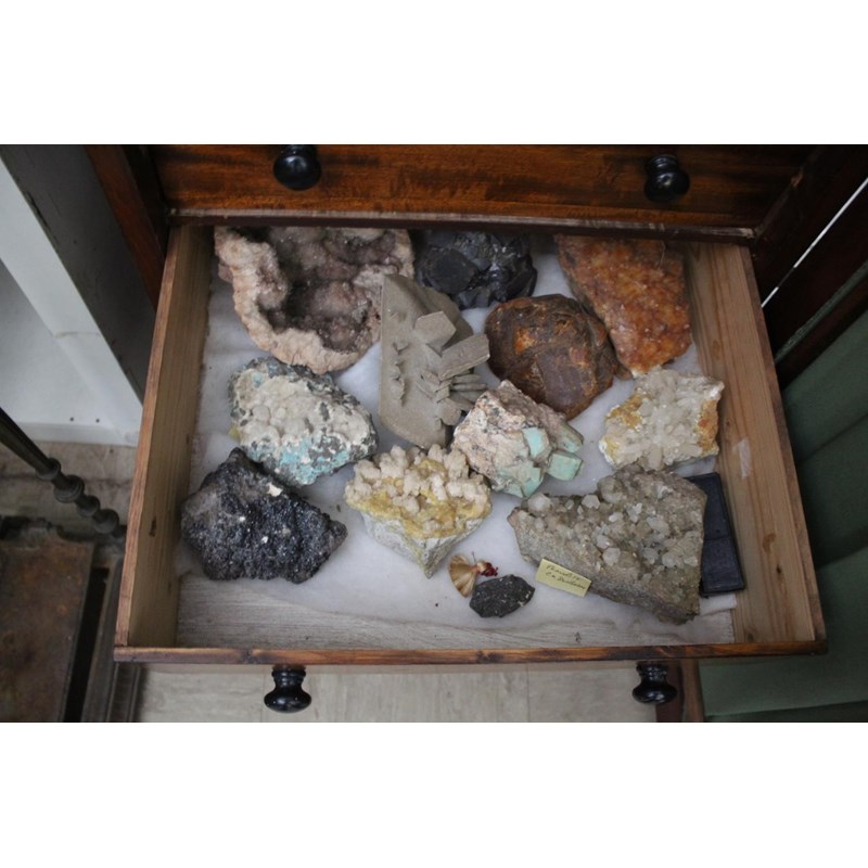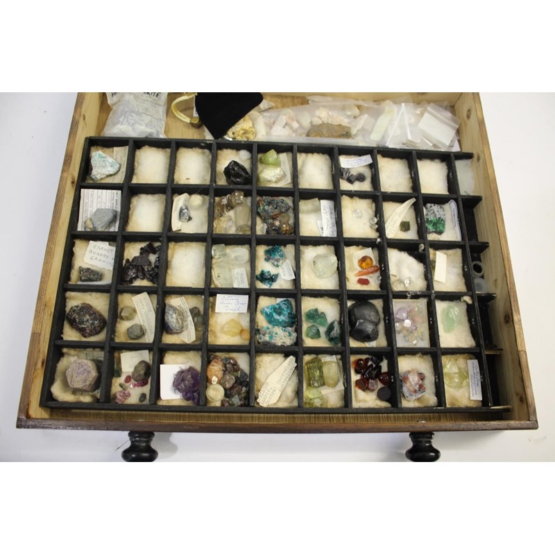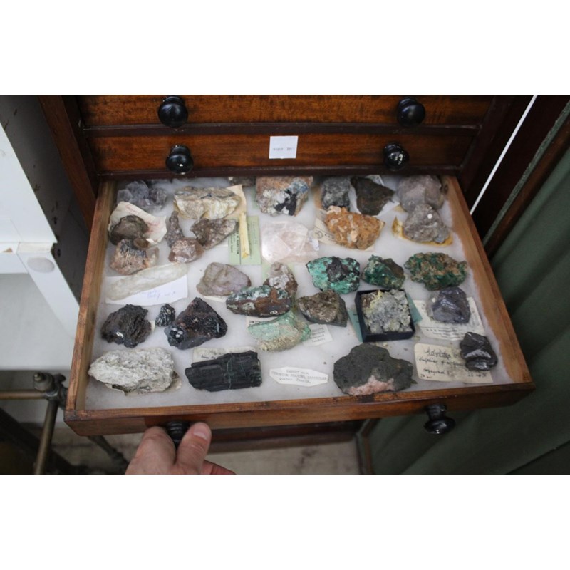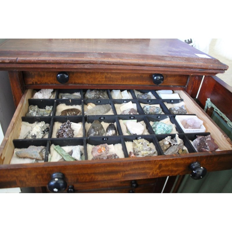 a large mahogany 16 drawer cabinet, the drawers of varying sizes and with turned wooden handles, with a makers plaque for J T Crockett & Son, London. With a large qty of geological specimens and gemstones, many with annotated notes. Also with some reference books and loose specimens. 136cms high, 52cms across