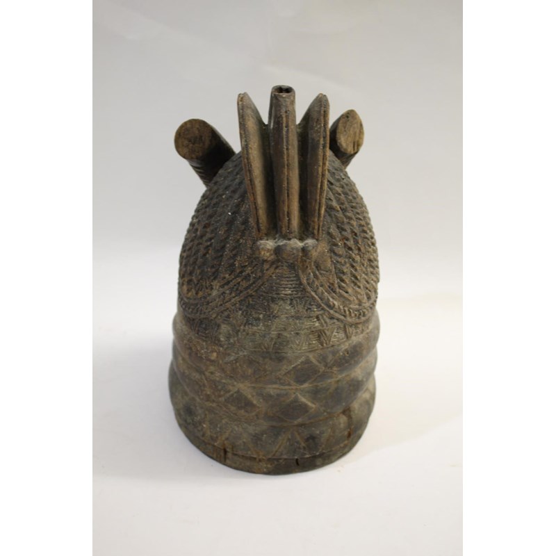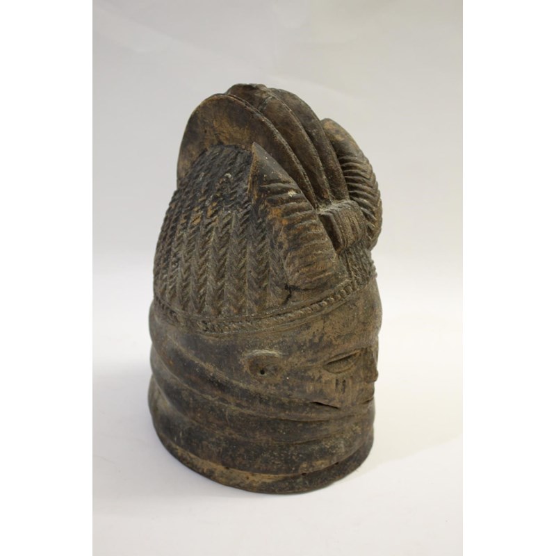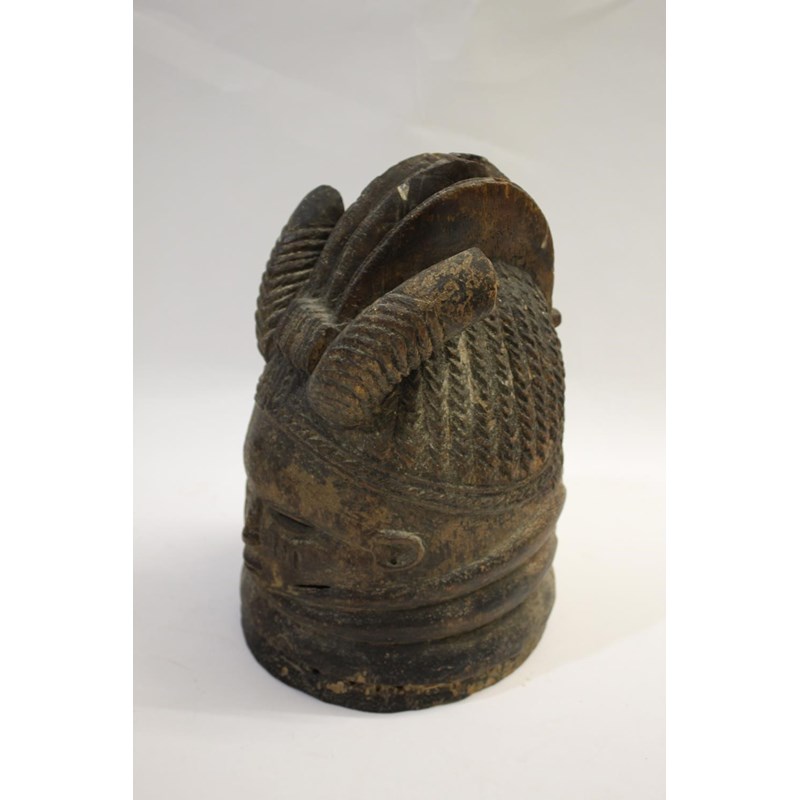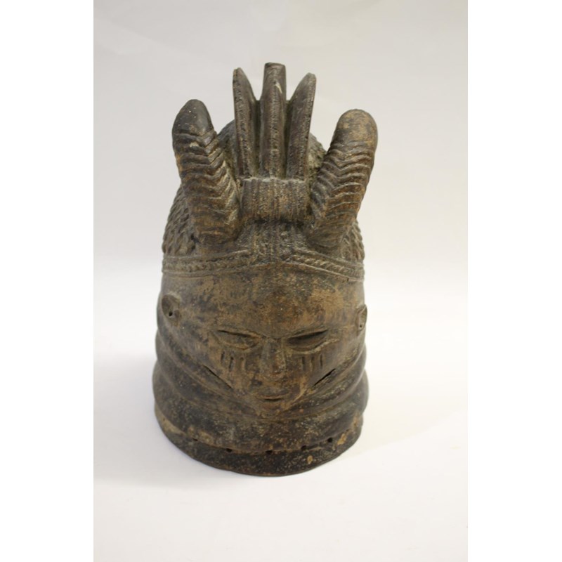 TRIBAL - MENDE HELMET MASK a tribal helmet mask from Sierra Leone, with horns and crested headdress and with pierced holes around the base. 32cms high