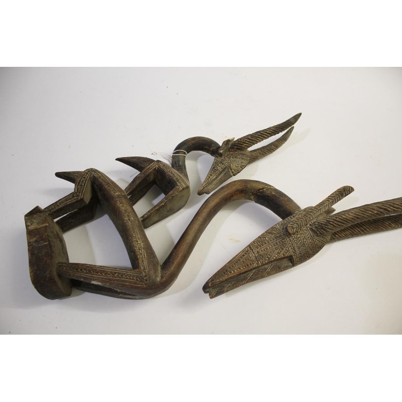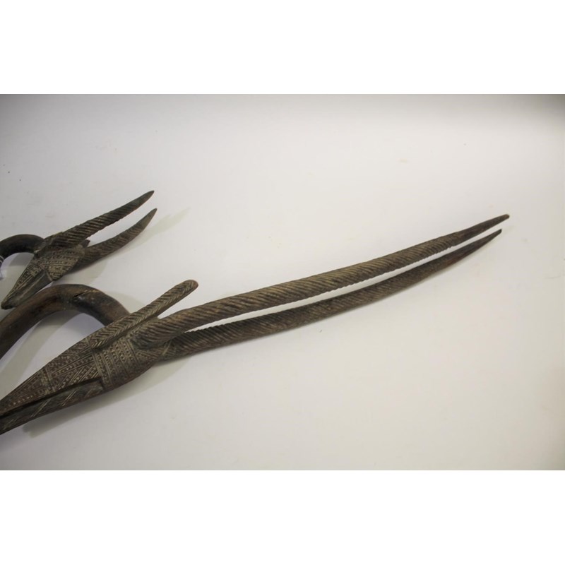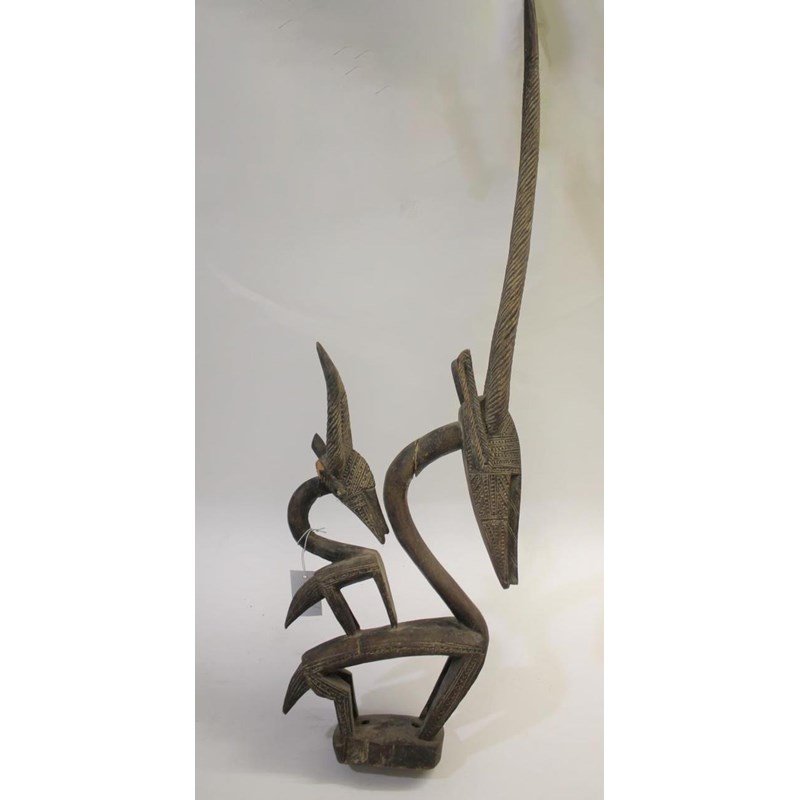 from Mali, with various carved decoration to the heads and bodies of the antelopes, and with spiral carved horns. With pierced holes to the base, some repairs. 90cms high