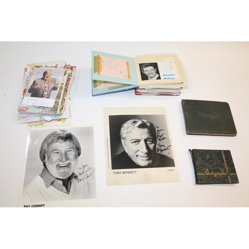 three autograph albums compiled in the 1950's and 1960's, some signed on photographs. Including Leslie Crowther, Hope and Keen, Engelbert Humperdinck, Ronnie Hilton, Ken Dodd, Joe Henderson, Tom Jones, Mike Yarwood, Sid James, Ray Ellington Quartet, Joe Loss and Orchestra, Deep River Boys, and many more. Also with various later cards with photographs in etc, including Tony Bennett, Frank Carson, John Inman, Jim Davidson, and many more.