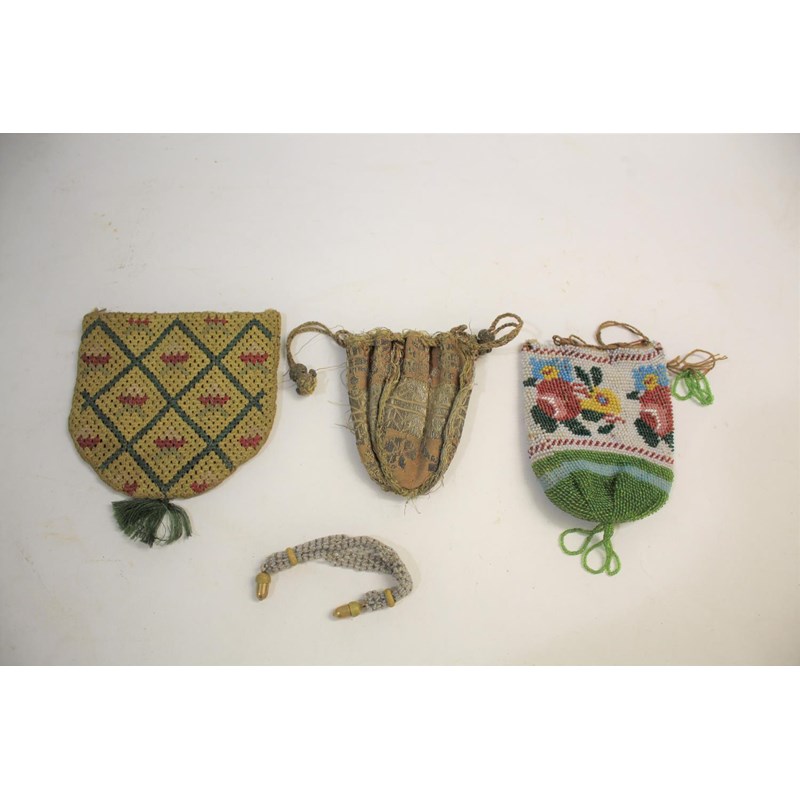 18THC WOVEN SILK DRAWSTRING PURSE with fine beadwork decoration (9.5cms high excluding tassels), with two later purses and a small beaded misers purse. (4)