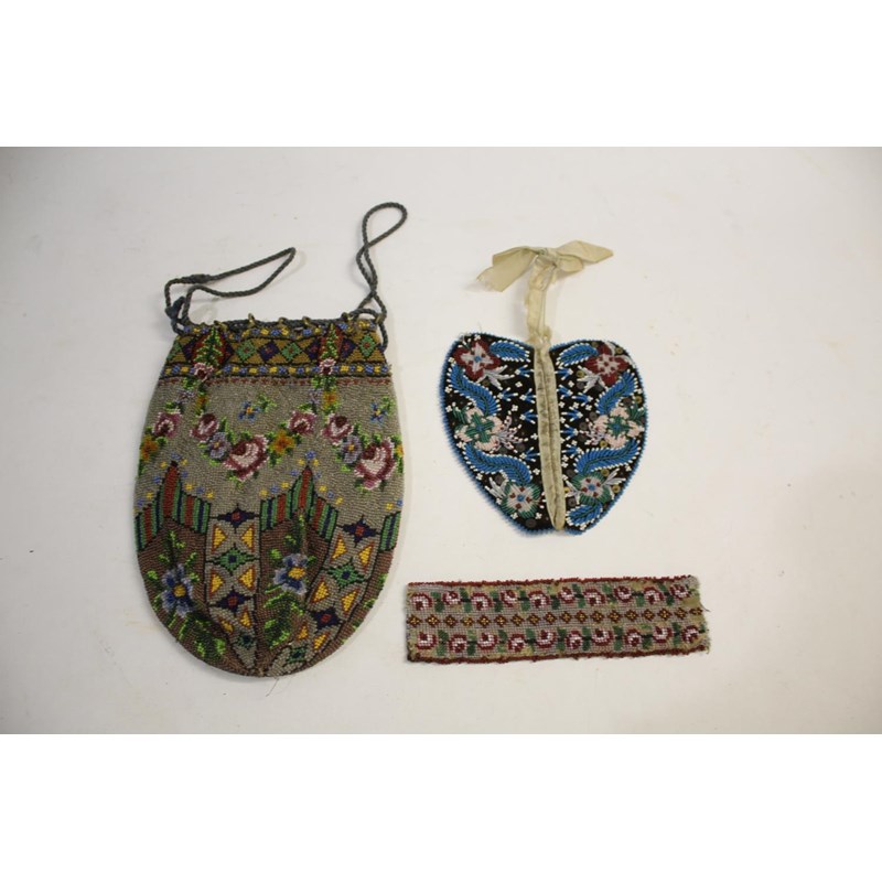 19THC DRAW STRING BEAD PURSE witha floral design and chamons leather lining, also with a heart shaped beadwork needle case and an incomplete beaded cuff. (3)