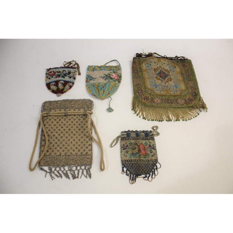 A LATE 19THC BEADWORK PURSE also with a cut steel beaded purse, and three further smaller beadwork purses. (5)