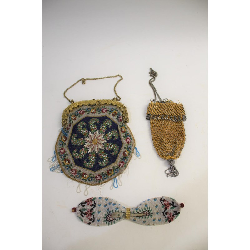 the bag with a gilt metal frame and chain, also with a yellow woven silk and cut steel beaded purse and a beadwork misers purse. (3)