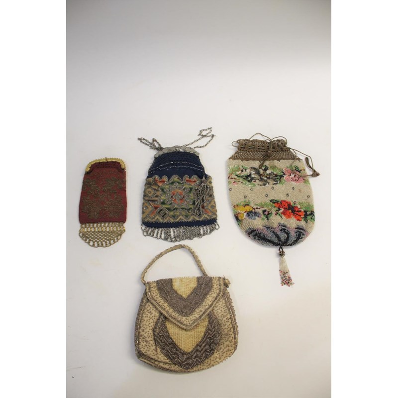 the beaded bag with a metal clasp, also with a beadwork draw string purse, a small red beaded purse with gilt metal clasp, and a 20thc beadwork evening bag. (4)