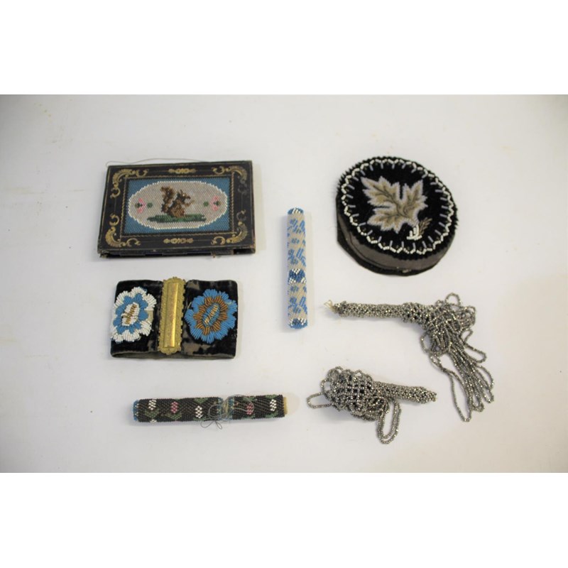 the notebook with a squirrel design to one side, also with two needle cases with beadwork covers, a beaded cuff, unfinished needle case and a pair of cut steel tassels.