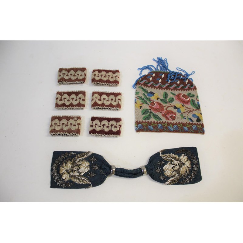 19THC GLASS & CUT STEEL BEADWORK PURSE with cherub decoration, also with a bead pouch and a set of beaded napkin holders.