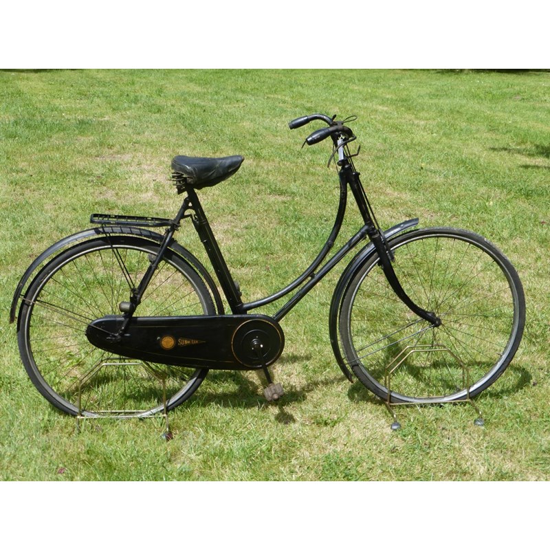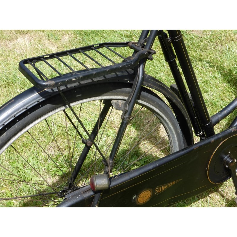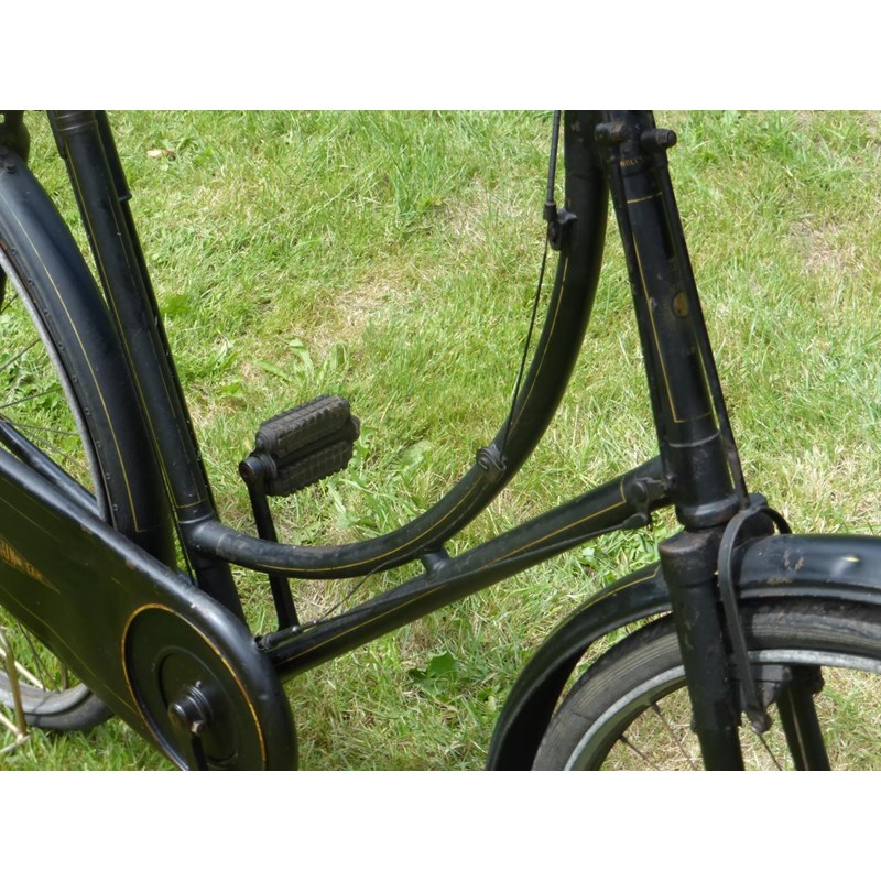 dating c1924 (?), having a frame number of 14784 4. With original black enamel, good box lining, chain case, two-speed bottom bracket, 18-inch handlebars, roller lever brakes, fabric saddle, rear rack and a pneumatic pump.