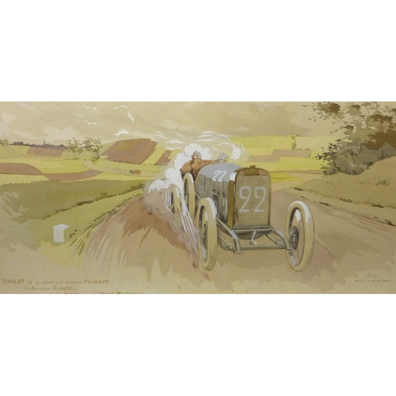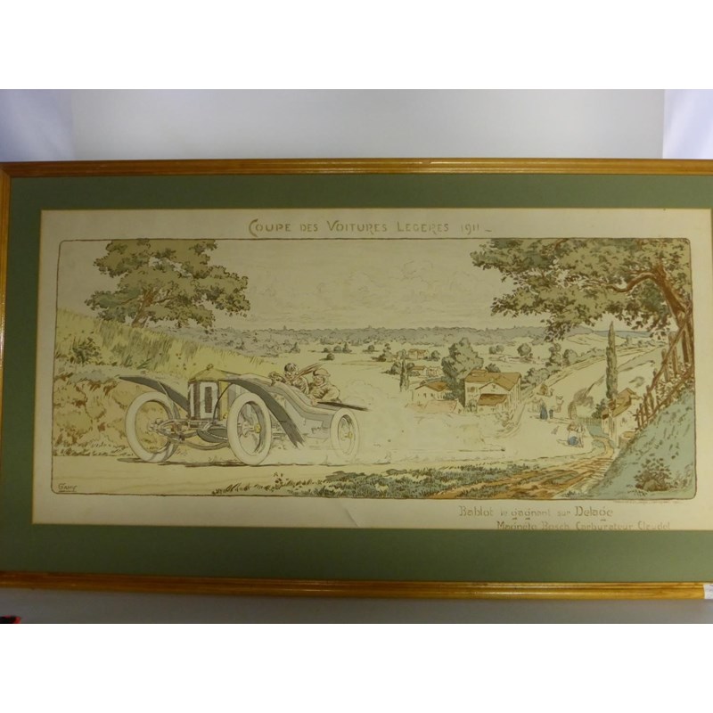 Comprising two large horizontal format colour prints, both published by Mabileau, Paris, and both a little faded. The first, mounted and framed, but unglazed, is Coupe des Voitures Legeres 1911: Bablot la gagnant sur Delage - Magneto Bosch Carburateur Claudel. Visible sheet size 16 x 34¼-inches (40½ x 87cm). The other, mounted on board, is entitled Grand Prix de l' A. C. F. 1912 - Boillot le gagnant sur Voiture Peugeot - Carburateur Claudel - magneto Bosch - roues Rudge-Whitworth 17¾ x 35½-inches (45 x 90cm). (2)