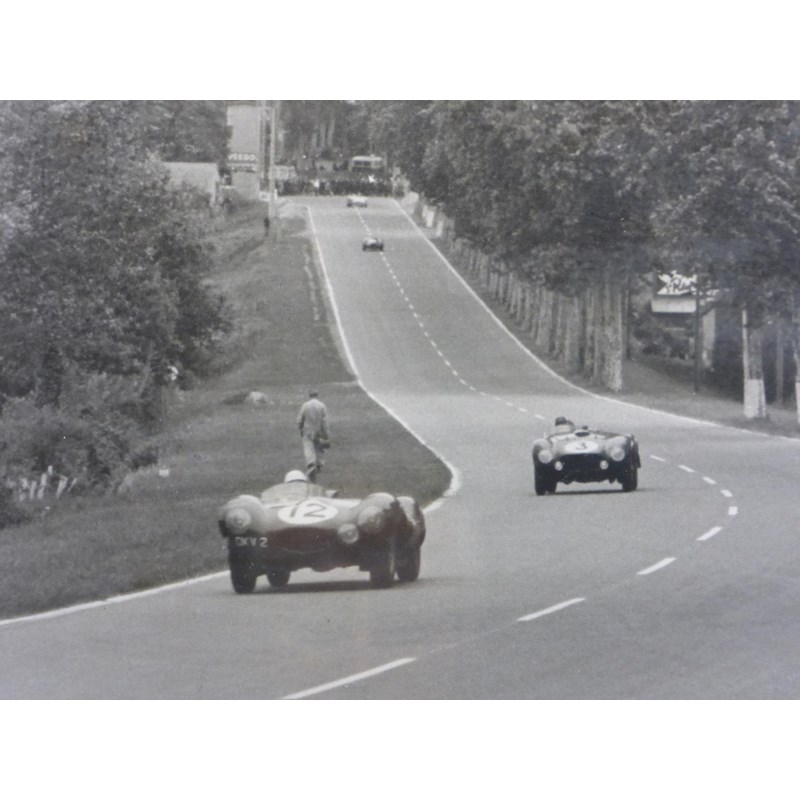 Six large format monochrome framed photographs, largest frame size 17 x 21-inches (43 x 53cm) of mainly motor racing events in the 1950s, comprising: British Grand Prix, Silverstone July 1953, Fangio in his Maserati A6G (unglazed); Le Mans 1954, Gonzalez - Ferrari, Peron - Osca, & Hermann - Porsche; Le Mans 1954, Moss/Walker - Jaguar 'D' & Maglioli/Mariotto - Ferrarei 4.9; another of an unidentified driver, possibly Fangio (lower edge of mount damp-stained); a large vertical format image (not mounted) labelled as being by Geoff Goddard of the XX Grand Prix de Monaco, 3/6/1962 - Bruce McLaren - Cooper 60; and a smaller format image of a Mercedes Benz, 1955, these five all glazed. (6)