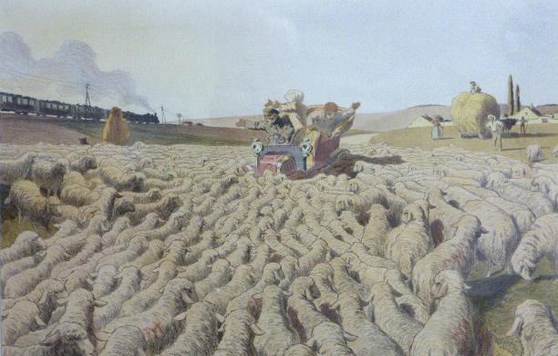 A coloured lithographic print issued in 1905 in a limited edition of only 100 copies, this example numbered 60 and signed in pencil by the artist in the bottom margin on the right-hand side. The image is of a veteran car stranded in the middle of a field and surrounded by a huge flock of sheep, the driver and his two passengers gesticulating wildly while a group of farmworkers look on and a passenger train passes by on an embankment. Red print along the bottom margin reads: Ed. Sagot - Editeur - Paris. Imp. CHAIX, Paris - Tous droits reserves. Printed artist's signature and the date '05 in the bottom right-hand corner of the image. The image is reproduced in The Motor Car in Art by Zolomij, Automobile Quarterly Pub., 1990. Mounted, framed and glazed. Image size, including the margins, 14.25 x 20.75-inches (36 x 53cm). Good condition and colour.