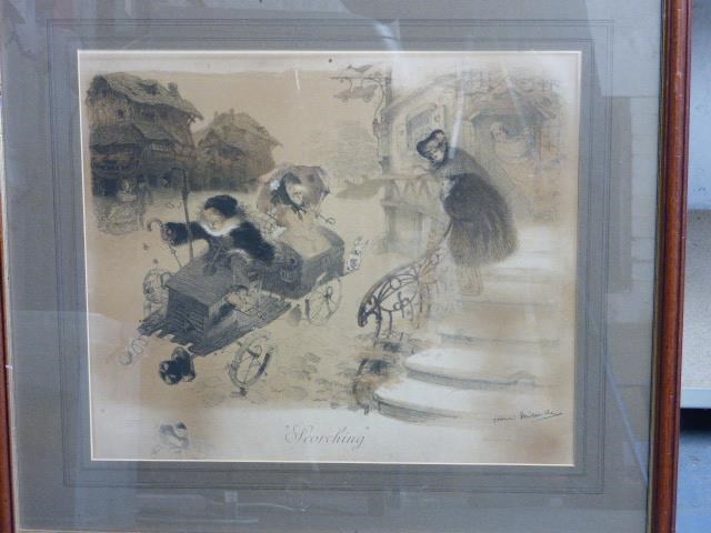 An original sepia-coloured lithographic print published by Fortier et Marotte in March 1906, as indicated in the bottom left-hand corner of the image, depicting two children racing down a village street in their battered home-made car, a puppy balanced precariously on the rear, the effect being quite surreal. This is one of Mirande's celebrated humorous works. Printed artist's signature in the lower right-hand corner. Visible sheet size 17.75 x 21-inches (45 x 53cm). Mounted, framed and glazed. Some browning to the image, and a short (3cm) abrasion in the centre of the top edge of the sheet (not affecting the main image), otherwise good.