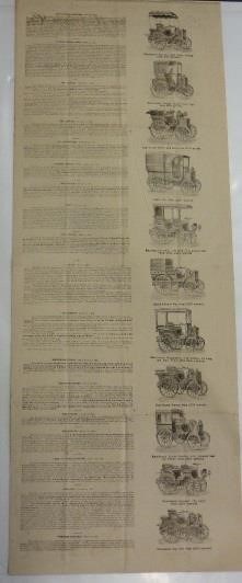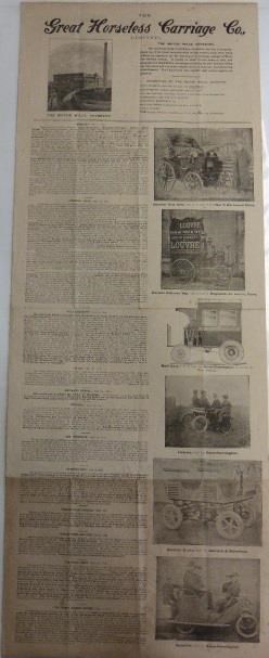 The Great Horseless Carriage Co., Limited, The Motor Mills, Coventry. A large, vertical format double-sided printed advertising sheet, dating from 1896 and promoting the company's wares, with an illustration and description of the Mills, six images of motor vehicles of the period, numerous press encomiums, and further text and images on the reverse. Horizontal crease marks where formerly folded and some browning and slight soiling through age, but now behind clear polythene in an appropriately sized folder, and a remarkable surviving example of period press publicity. Size of sheet 40x 15-inches (101.5 x 38cm).