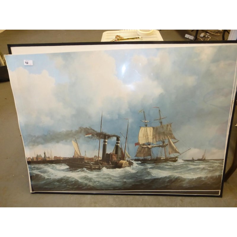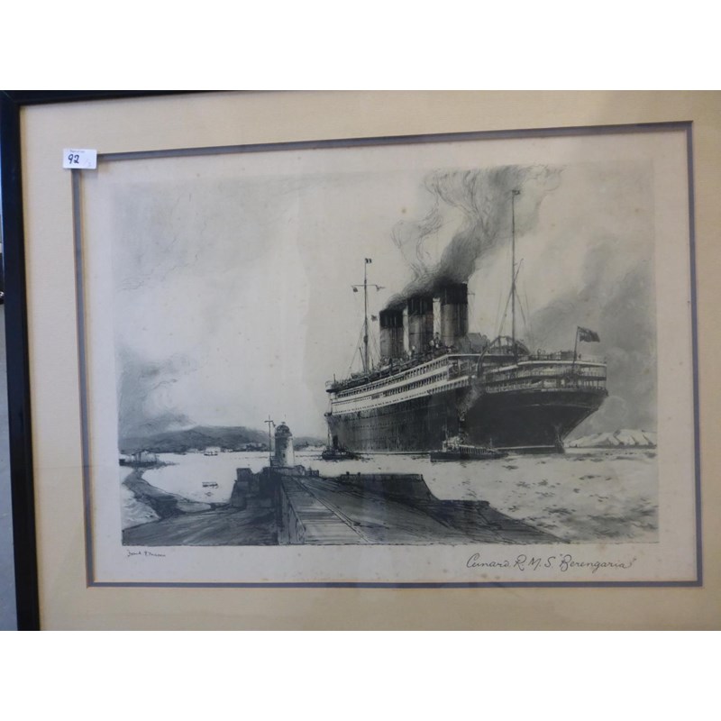 A limited edition (1/25) lithographic print of his original oil painting, framed and glazed, 85 x 65-cms. Also, a print of RMS Berengaria leaving Liverpool, framed and glazed, and two quality prints of the tugboat 'Hercules' leaving a Dutch harbour, unframed but held in a portfolio folder, 100 x 70-cms. (3)