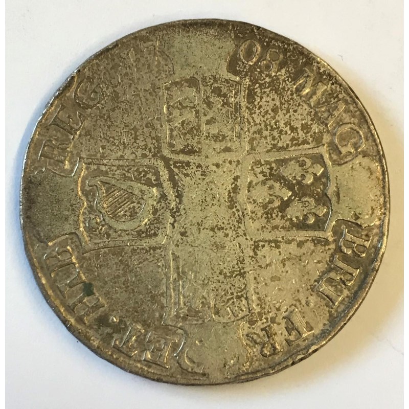A Queen Anne Crown dated 1708, second draped bust l, with E below the bust for Edinburgh mint, reverse with crowned cruciform shields. Regnal year Septimo to the rim.