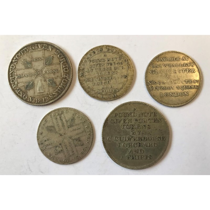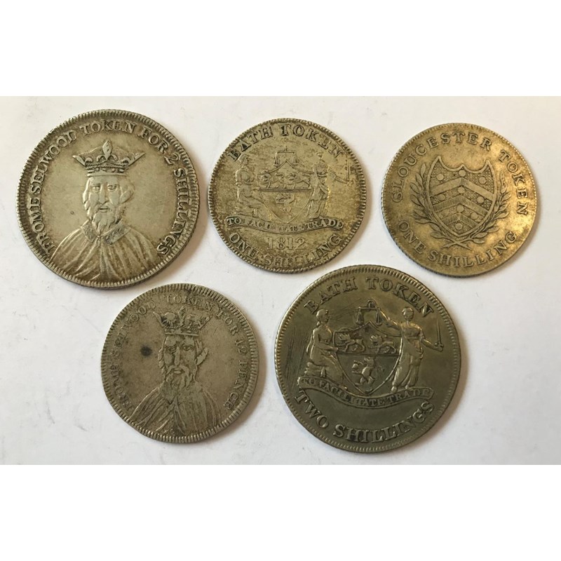 A two shilling Bath Token Isaac Orchard and J. Phipps and a similar shilling dated 1812, a Frome Selwood token for two shillings dated for 1812 and a similar shilling token dated 1811, and a Gloucester one shilling token from J. Whalley. 5 coins.