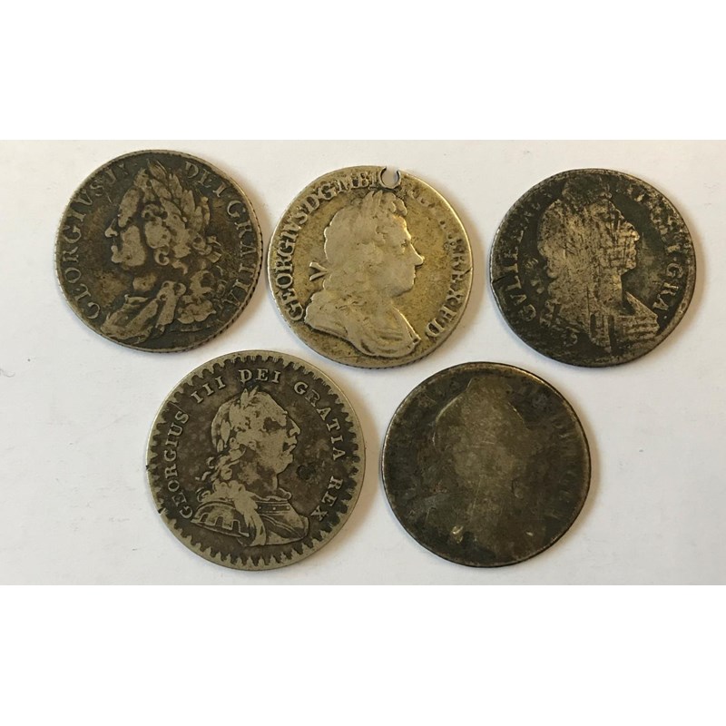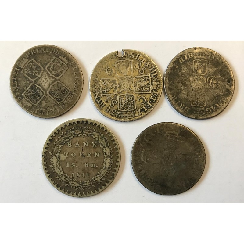 Shillings: two William III Shilling dates obscured, a George I Shilling dated 1723, SSC in angles, pierced for suspension, a George II Shilling dated 1758, old laureate and draped bust l, and a Bank Token 1s 6d dated 1811, over stamped 2. 5 coins.
