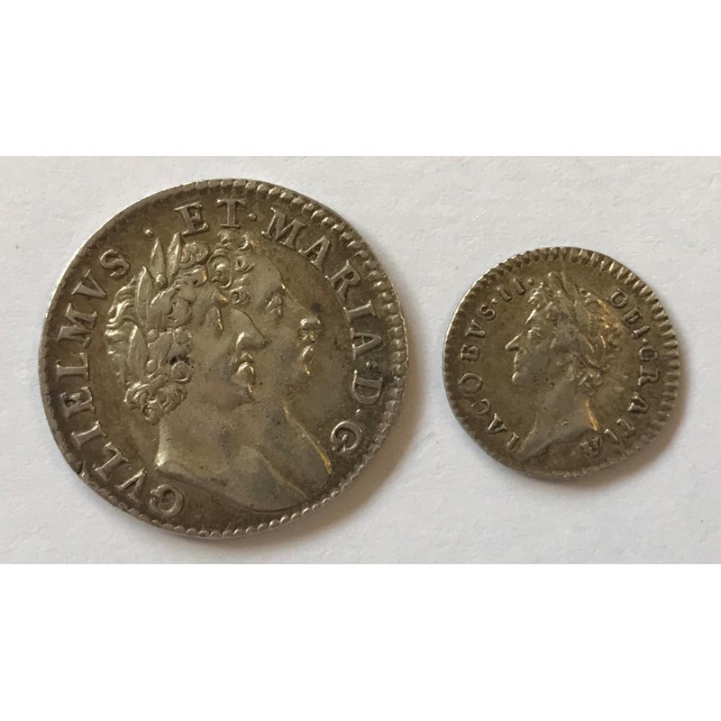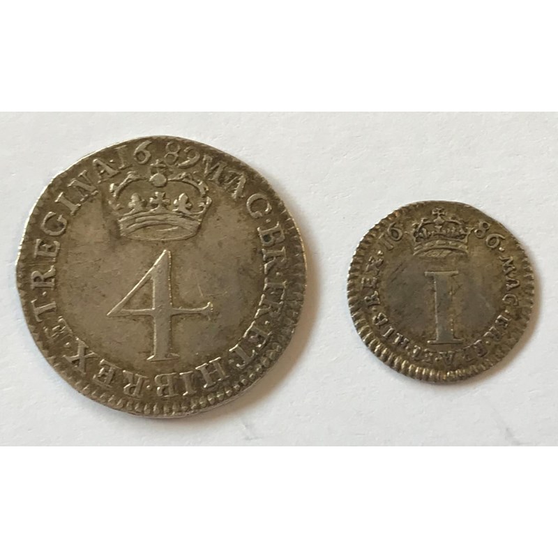 A James II Penny dated 1686, laureate head l, and a William and Mary 4d dated 1689, G below conjoined busts r. 2 coins.