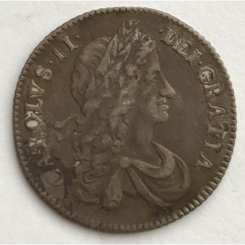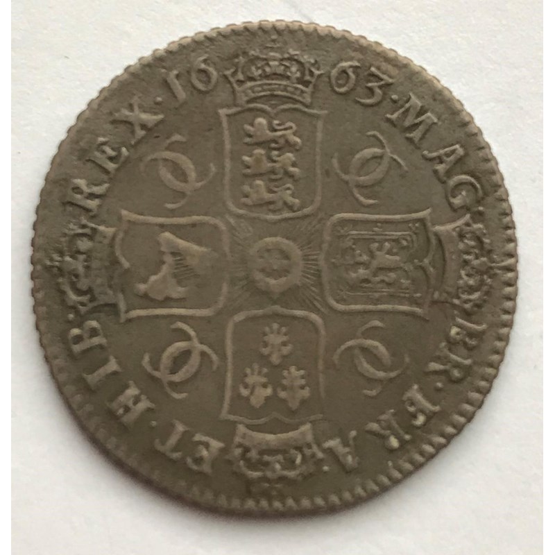 A CHARLES II SHILLING. A Charles II Shilling dated 1663, first draped bust r, regular die axis, interlinked Cs to angles.
