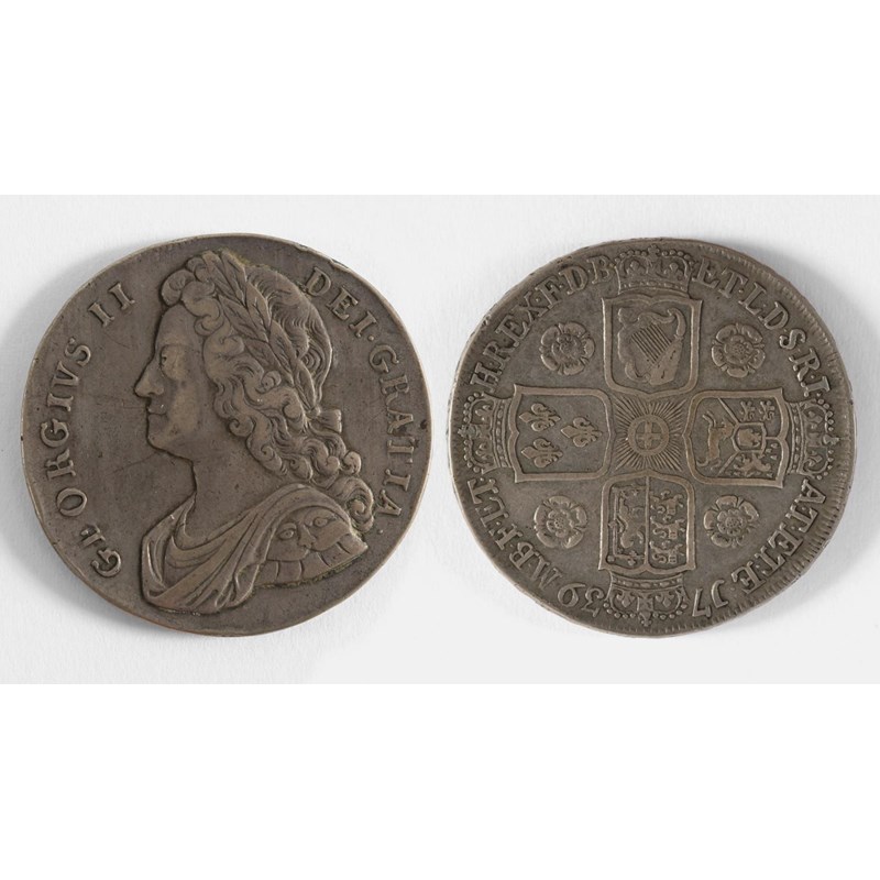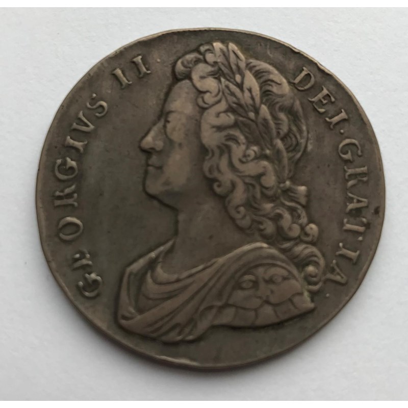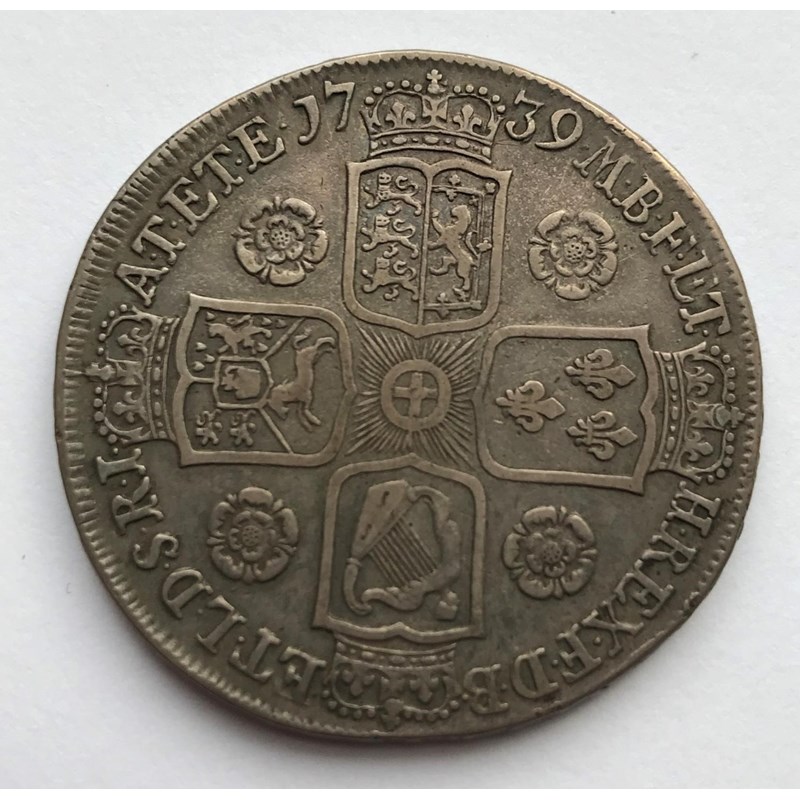 A GEORGE II CROWN. A George II Crown dated 1739, young laureate and draped bust l, roses in angles, regnal year to the rim Duodecimo.