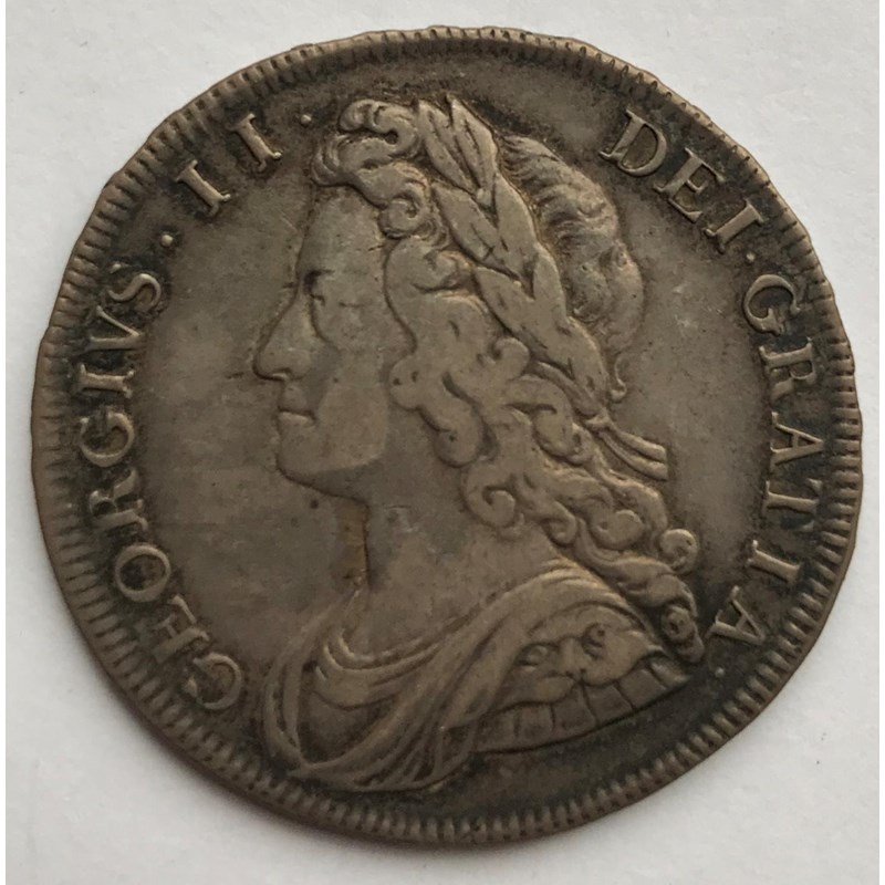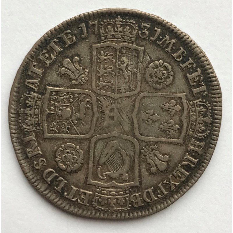 A GEORGE II HALFCROWN. A George II Halfcrown dated 1731, young laureate and draped bust l, roses and plumes, regnal year to the rim Quinto.