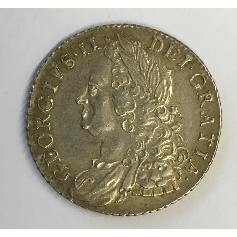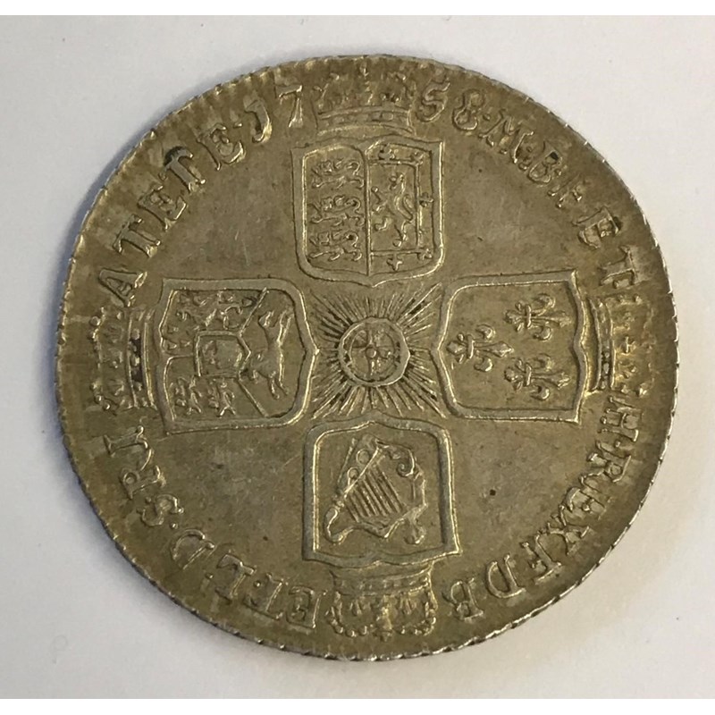 A GEORGE II SHILLING. A George II Shilling dated 1758, old laureate draped bust r, plain angles.