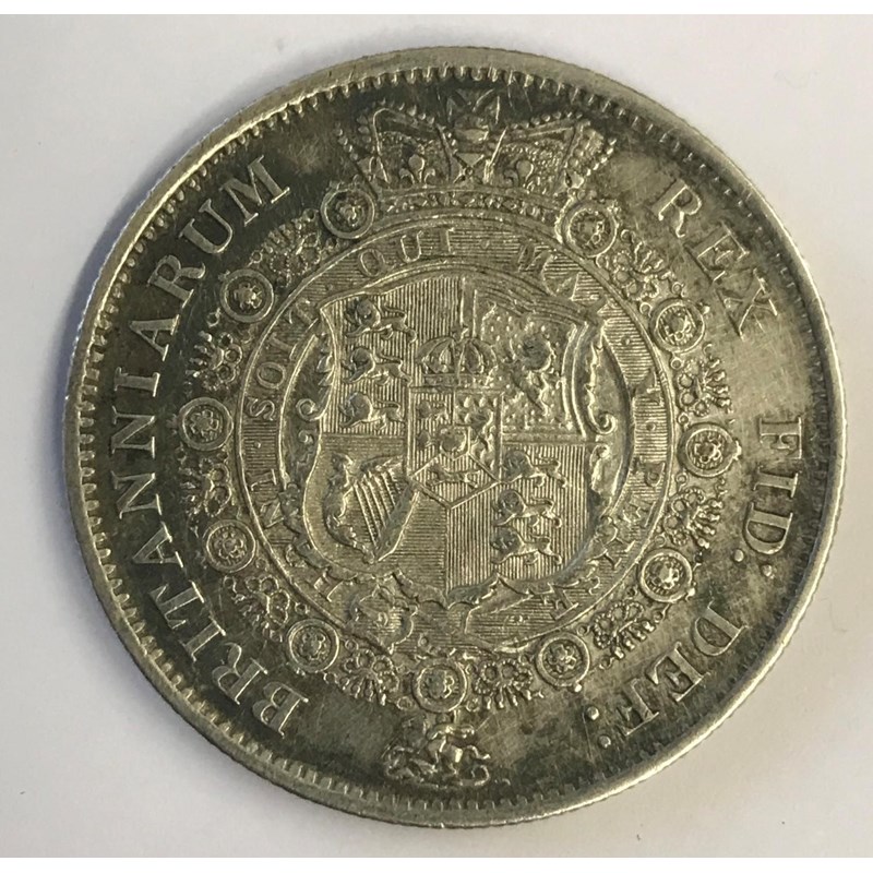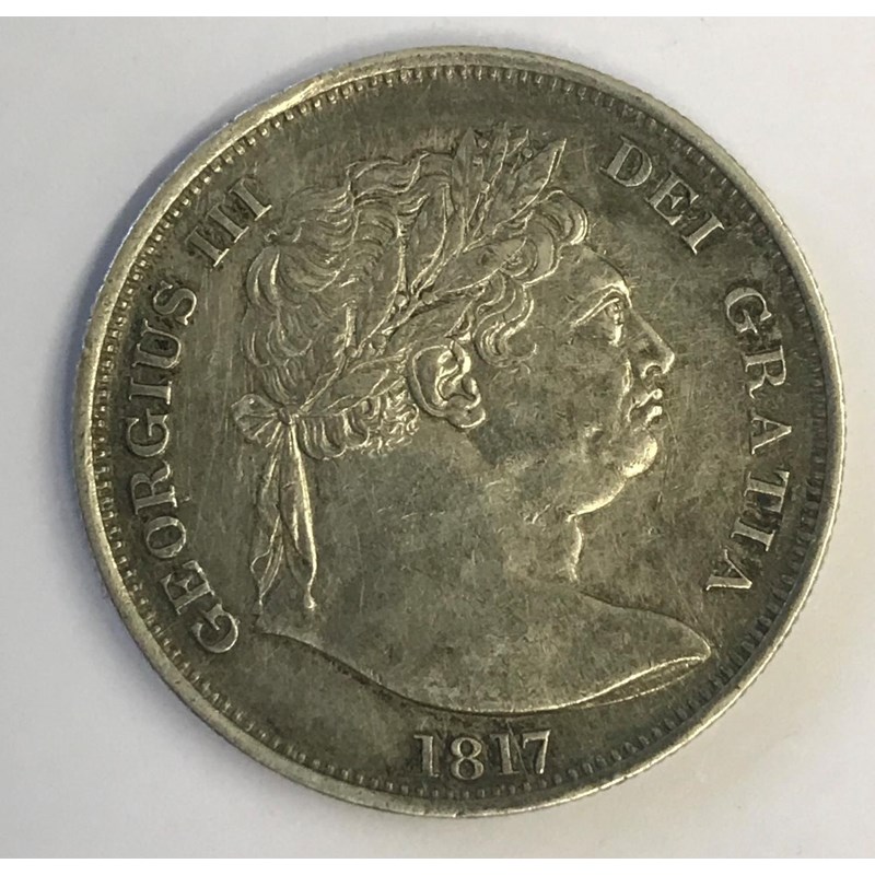 A GEORGE III HALFCROWN. A George III Halfcrown dated 1817, large 'bulls head' laureate bust r, reverse crowned garter shield.