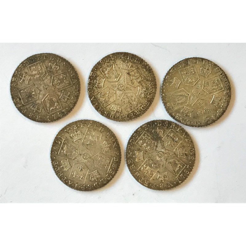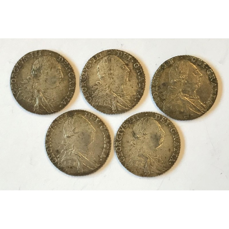 FIVE GEORGE III SHILLINGS. Five George III Shillings, all dated 1787 and without hearts, old laureate draped bust r, crowns in angles. 5 coins.