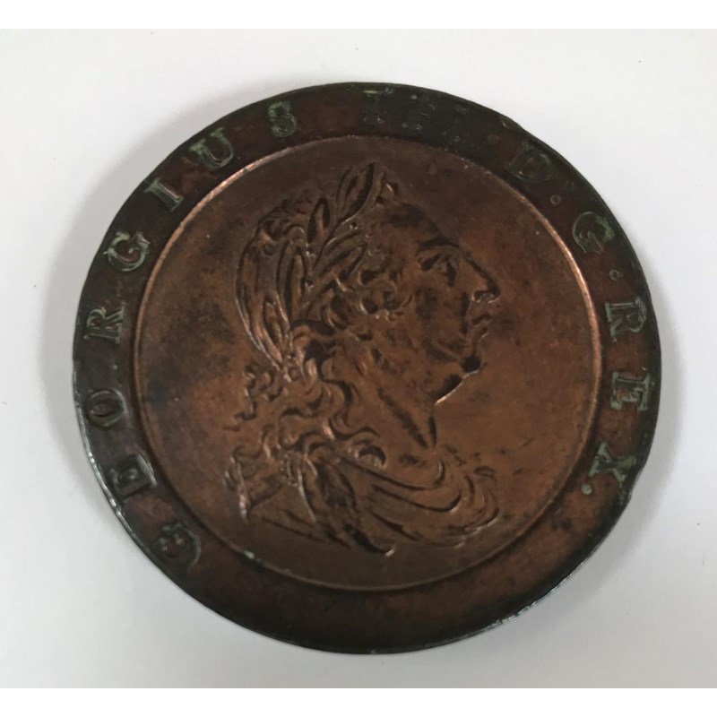 A GEORGE III TWOPENCE PIECE. A George III 'Cartwheel' twopence piece dated 1797, with traces of original lustre.