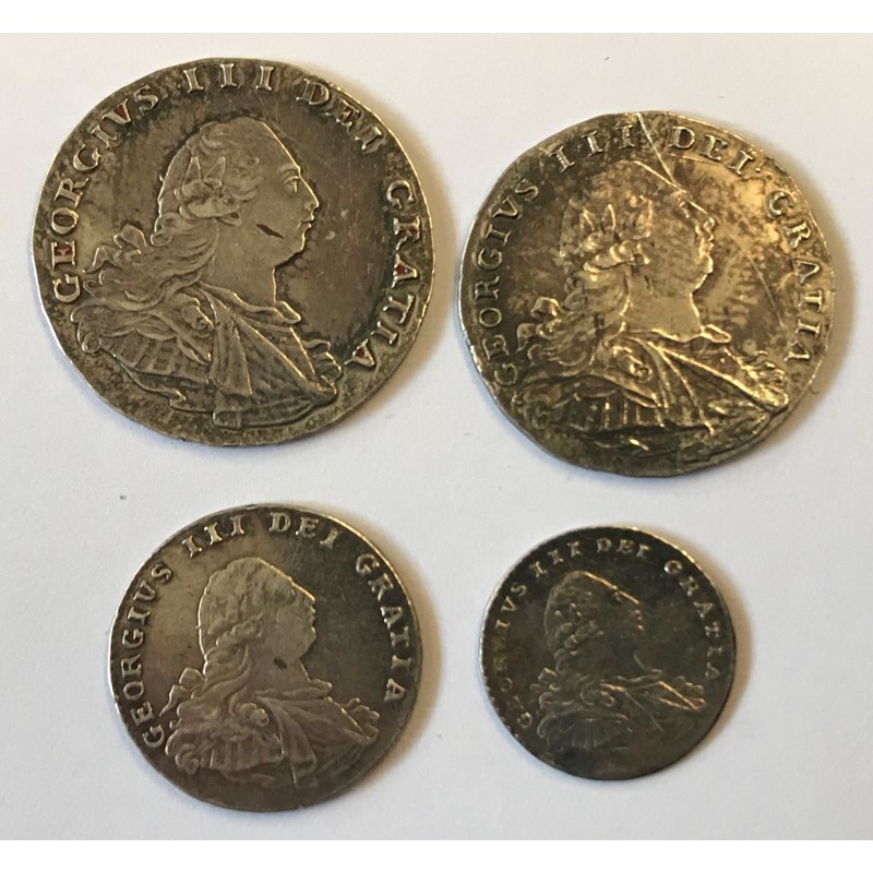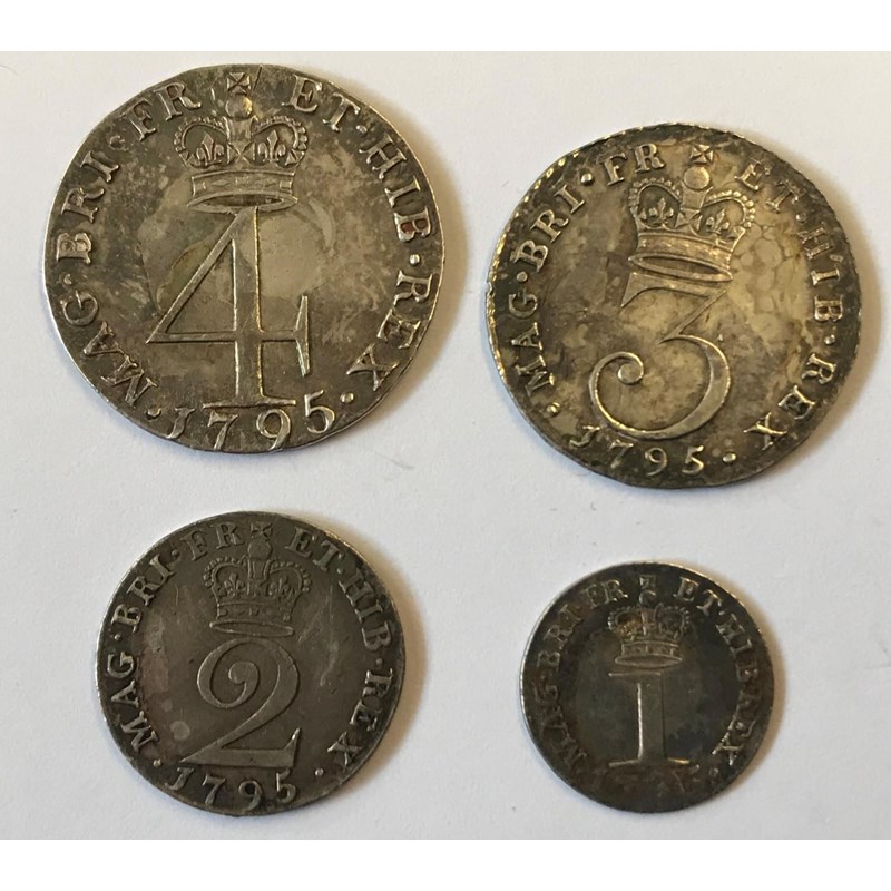 GEORGE III MAUNDY COINS. A set of George III Maundy coins for 1795 comprising 4d, 3d, 2d, and 1d, older laureate and draped bust r. 4 coins.