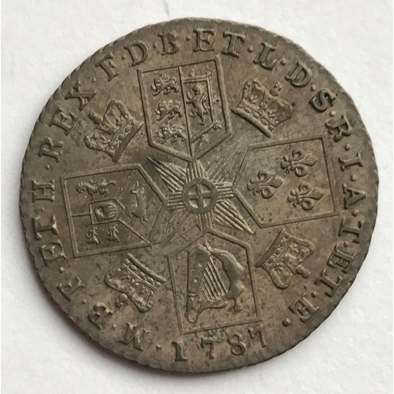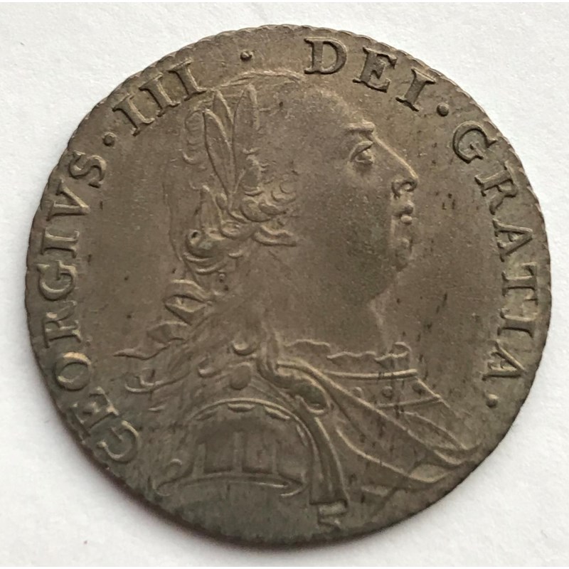 A GEORGE III SHILLING. A George III Shilling dated 1787, older laureate and draped bust, no semee of hearts.