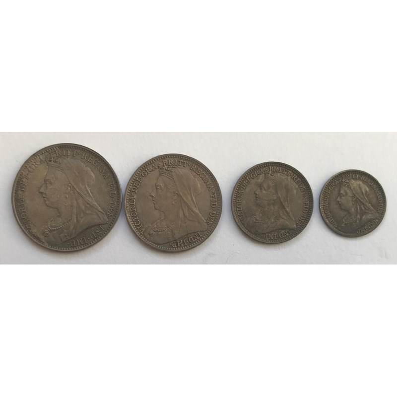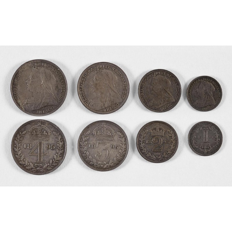 A SET OF VICTORIAN MAUNDY MONEY. Maundy coins dated 1895 comprising fourpence, threepence, twopence and penny, all Old veiled bust l. 4 coins.