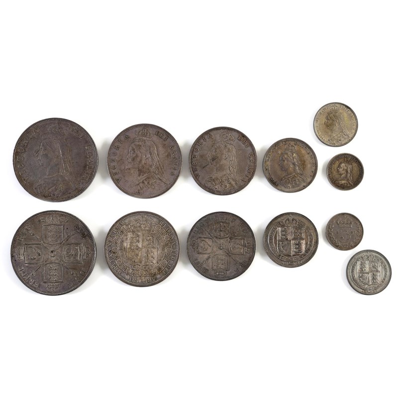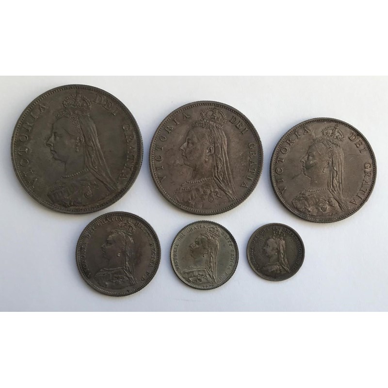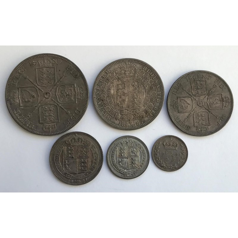 Comprising Double Florin, Halfcrown, Florin, Shilling and Farthing and Threepence, all Jubilee bust l, 6 coins.