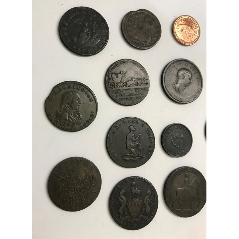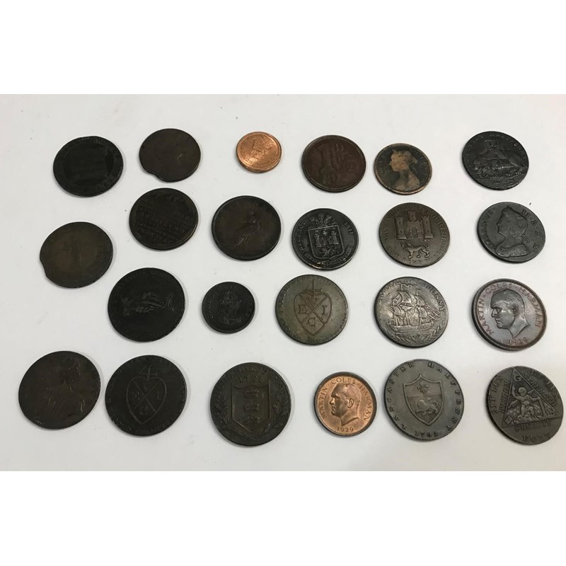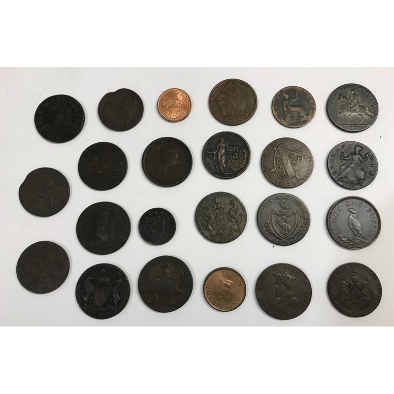 A small collection of tokens to include an 'Am I not a Man and a Brother' token, A Liverpool Halfpenny 1791, Two Lundy coins and others. 23 coins.