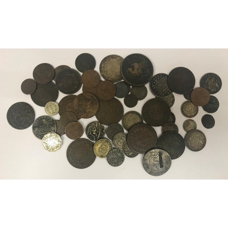 A COLLECTION OF WORLD COINS. Coins from India, Australia, Belgium, France and other countries to include an 1863 Hong Kong cent, 1814 Pfennig, 1836 Belgian cent, 1916 Australian Shilling and others. 52 coins.
