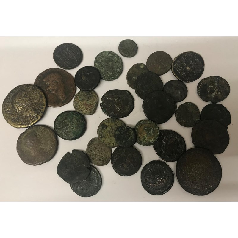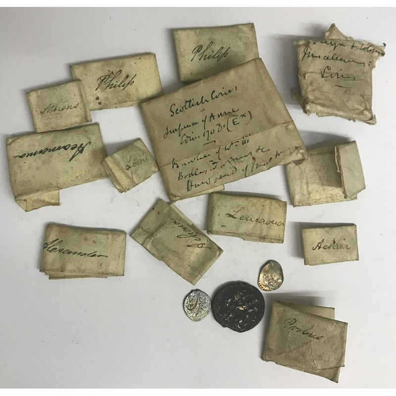 A COLLECTION OF ROMAN AND SIMILAR ANCIENT COINS. A collection of Roman coins to include raidates of Postumus, some in old collectors wrappers. A lot.