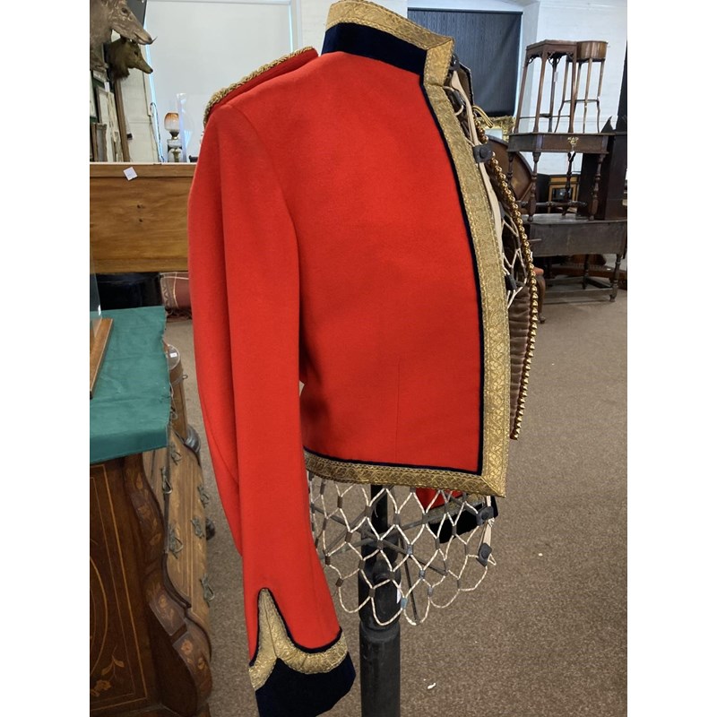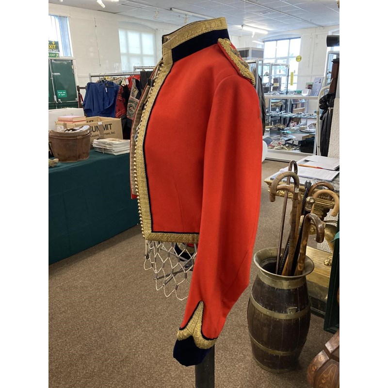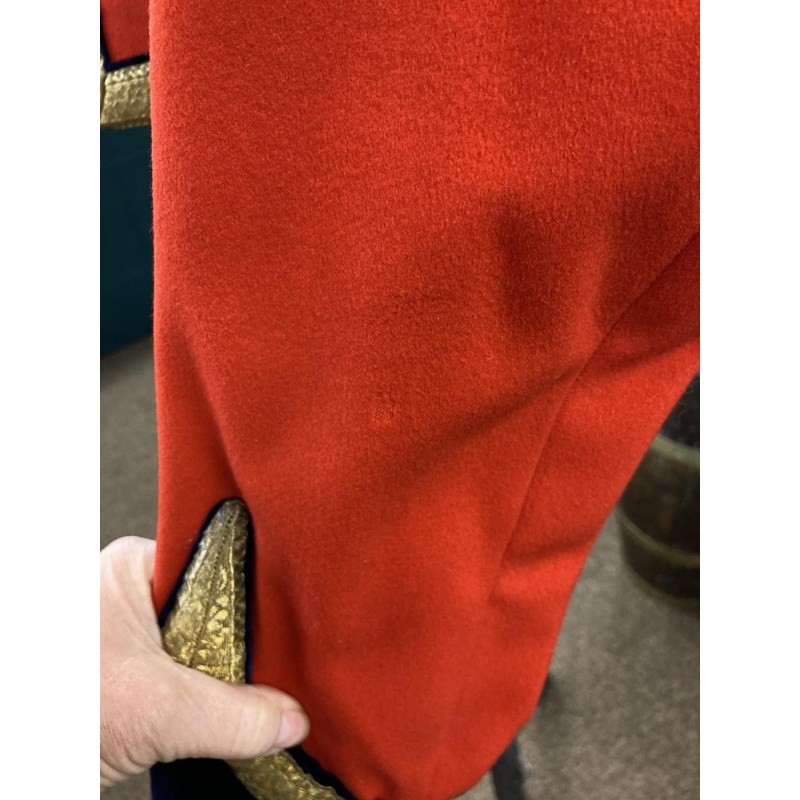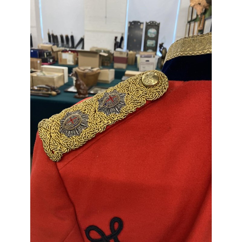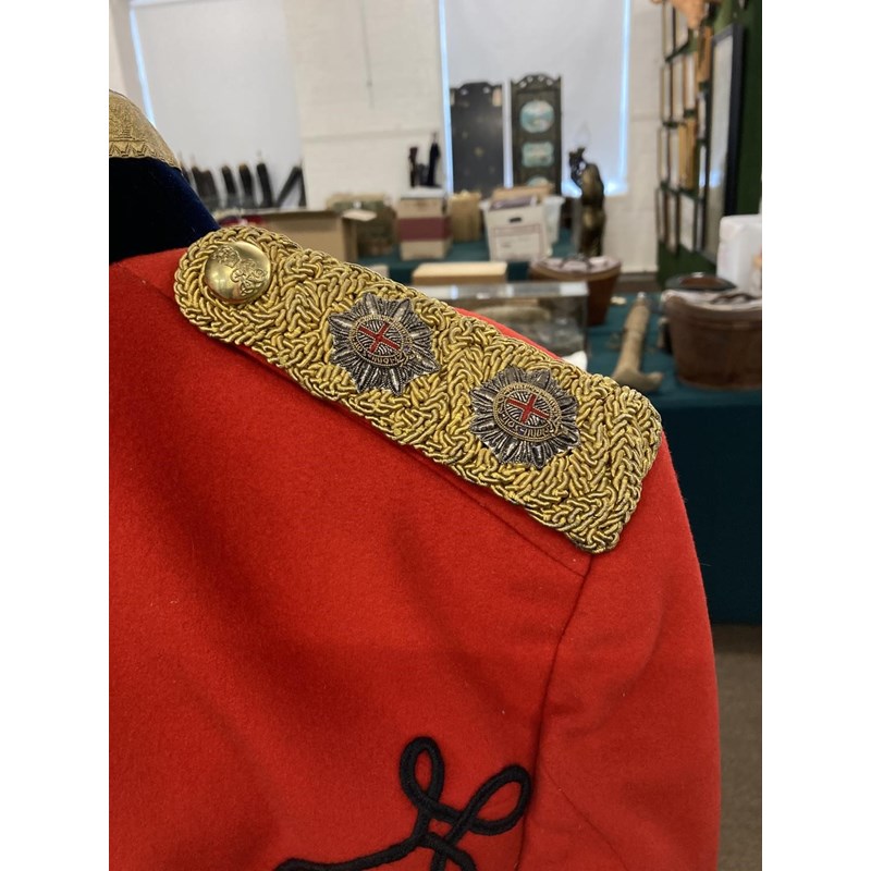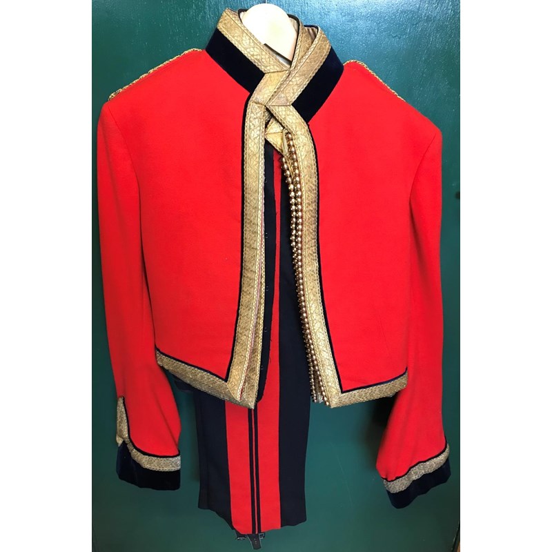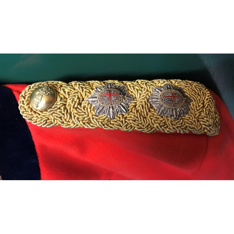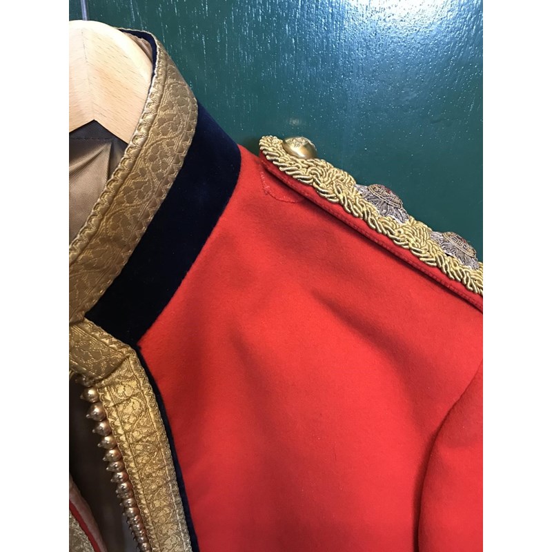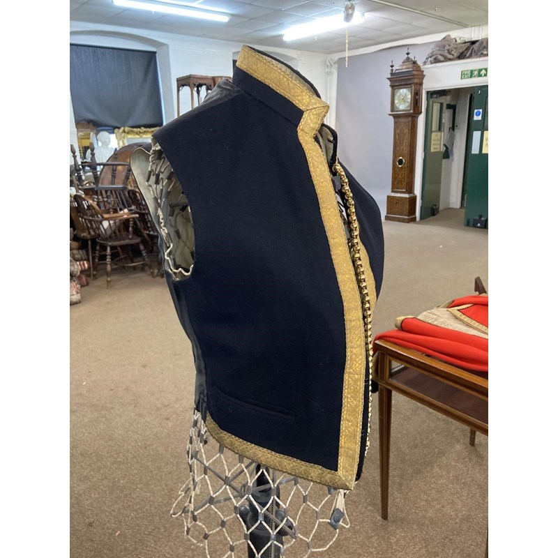 Mess Kit comprising dark trousers with red stripe, waistcoat with gold braid trim and gilt beaded border and red jacket with similar gilt work and velvet cuff and collar, with epaulettes for the rank of Lieutenant, the waistcoat and jacket with labels for Huntsman and Sons, 11, Saville Row London. See the following lot for a portrait of the officer wearing this uniform. See lot 582 for a portrait.