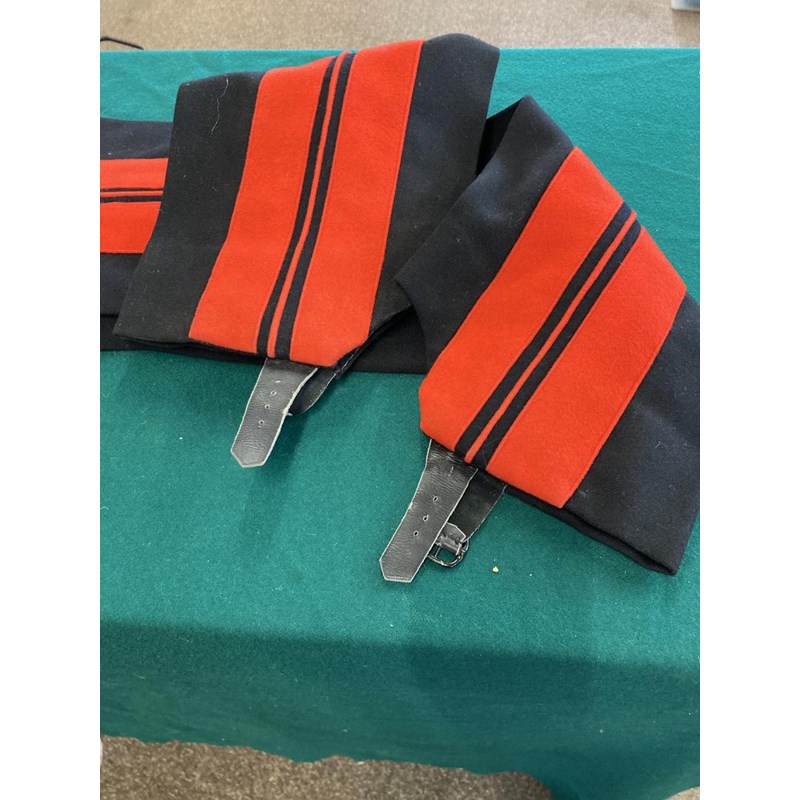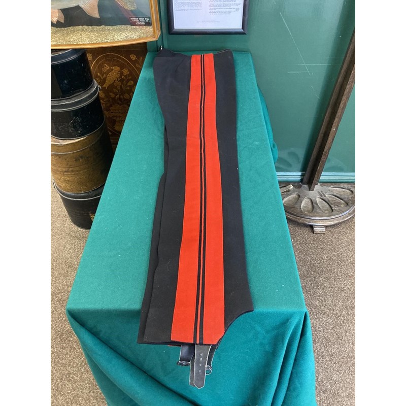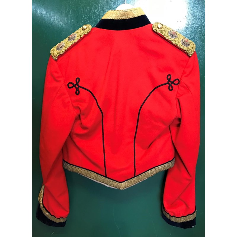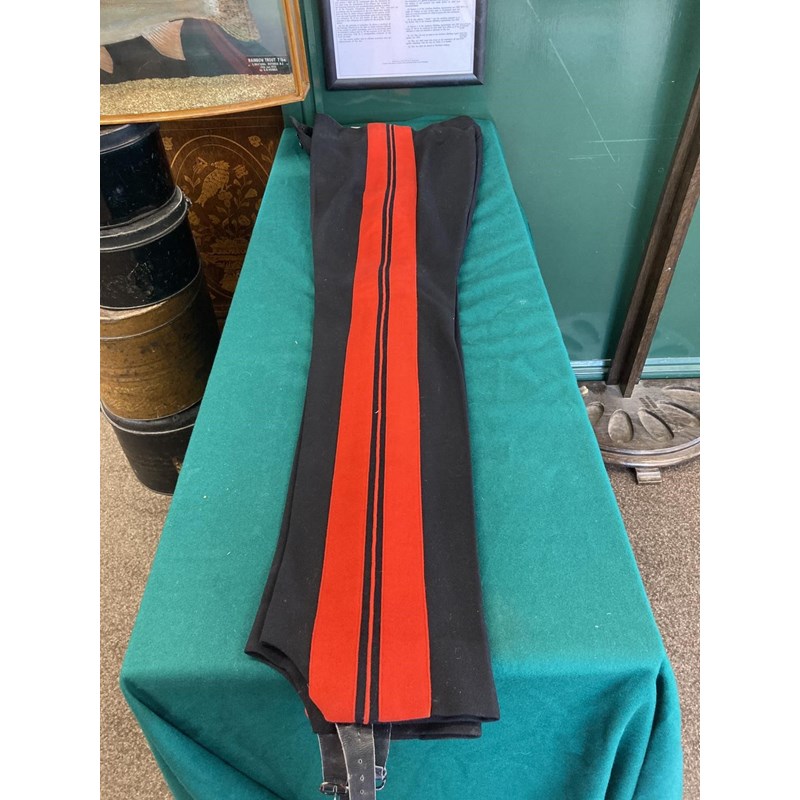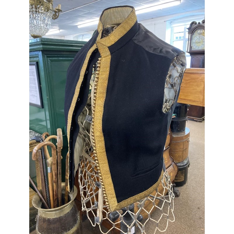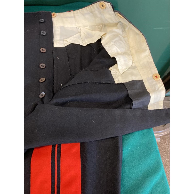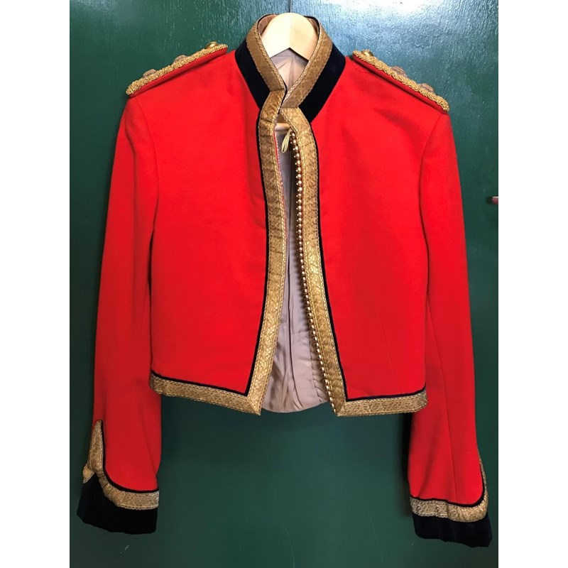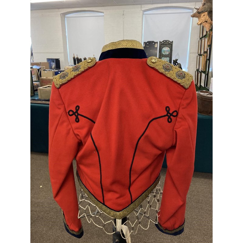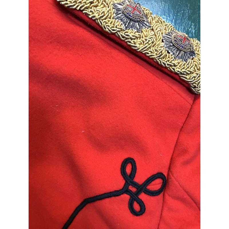 Mess Kit comprising dark trousers with red stripe, waistcoat with gold braid trim and gilt beaded border and red jacket with similar gilt work and velvet cuff and collar, with epaulettes for the rank of Lieutenant, the waistcoat and jacket with labels for Huntsman and Sons, 11, Saville Row London. See the following lot for a portrait of the officer wearing this uniform. See lot 582 for a portrait.