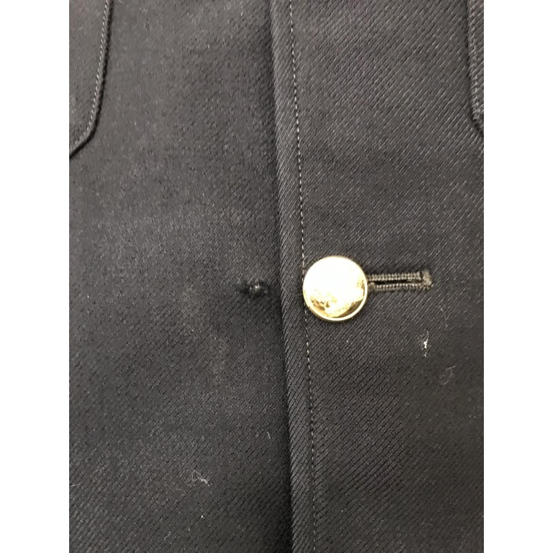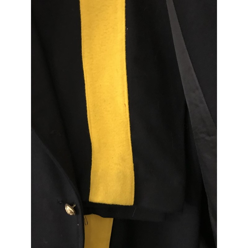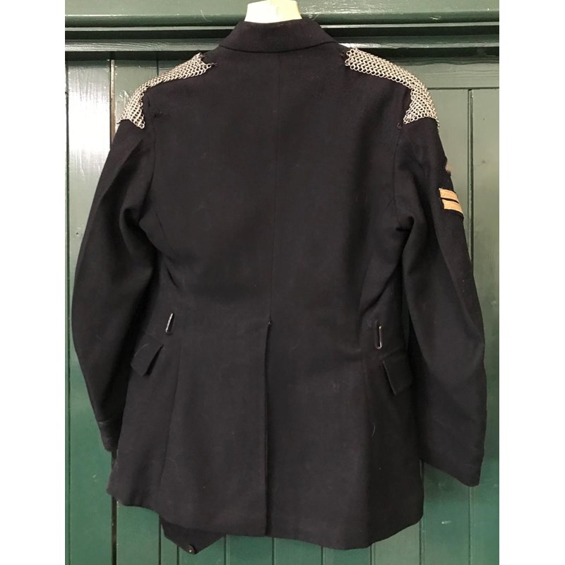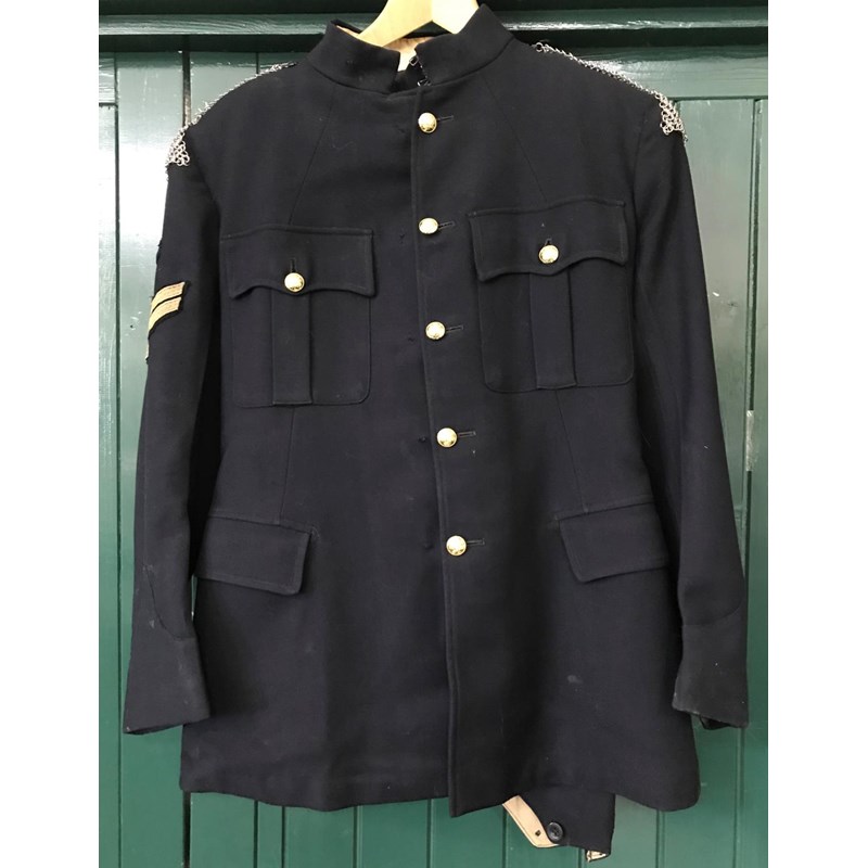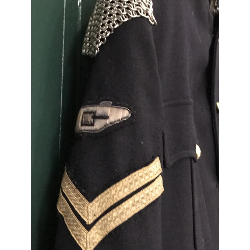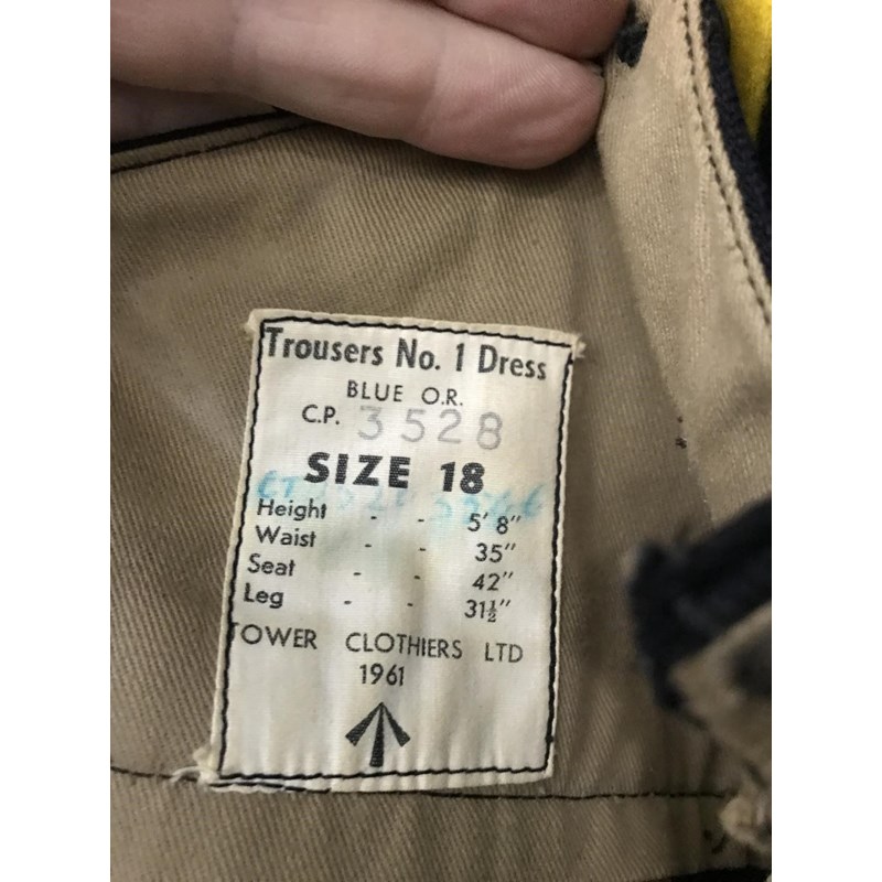 A post war No 1. Blues uniform the jacket 'Jacket, No.1 Dress Blue, O.R. Size 24' by Lotery & Co. The trousers size 18 by Tower Clothiers dated 1961. The jacket with chain mail shoulders, tank corps patch and corporals stripes. The trousers with broad yellow stripe.