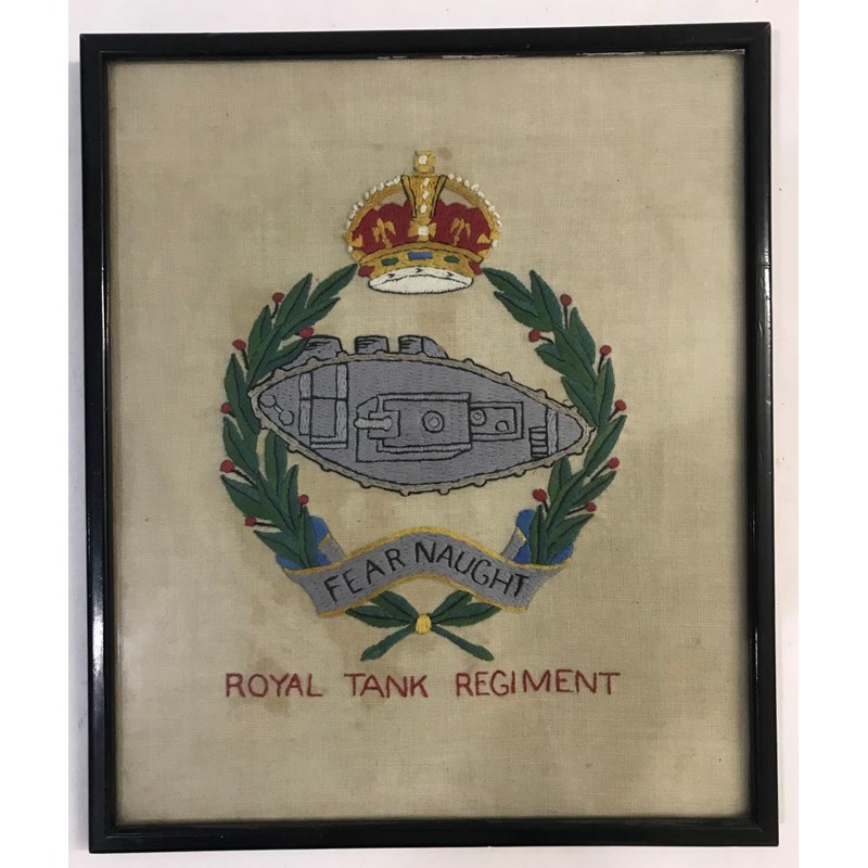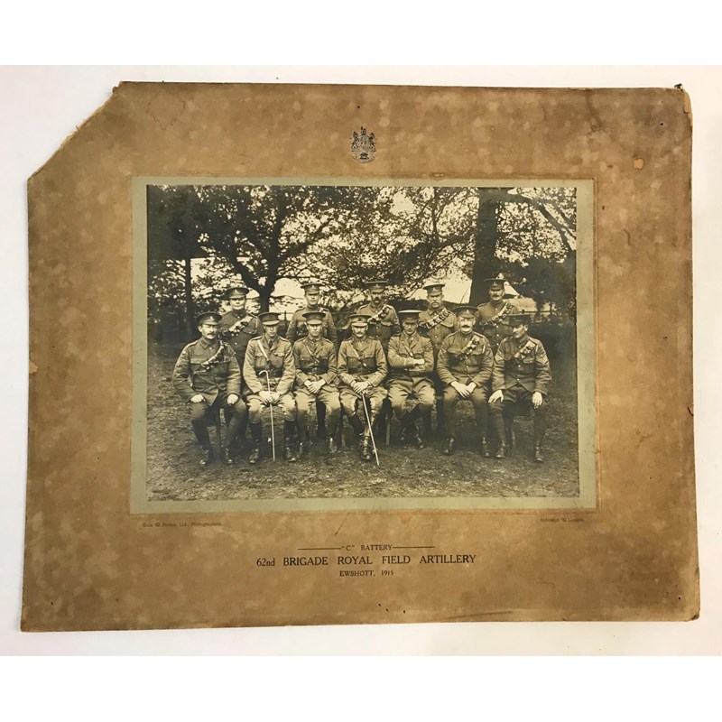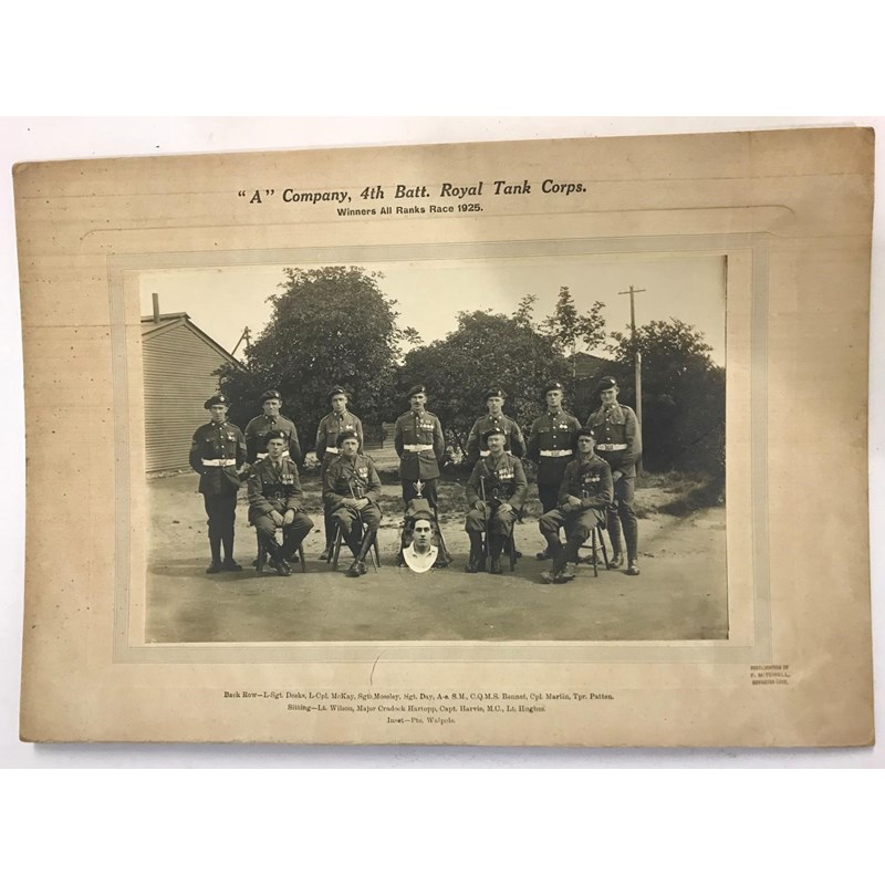 A photograph of 'A' Company 4th Batt. Royal Tank Corps, winners all ranks rac 1925, A photograph of 'C' Battery 62nd Brigade "Royal Field Artillery, Ewshott, 1915, A Royal Tank Regiment needlework and another photograph. 5.