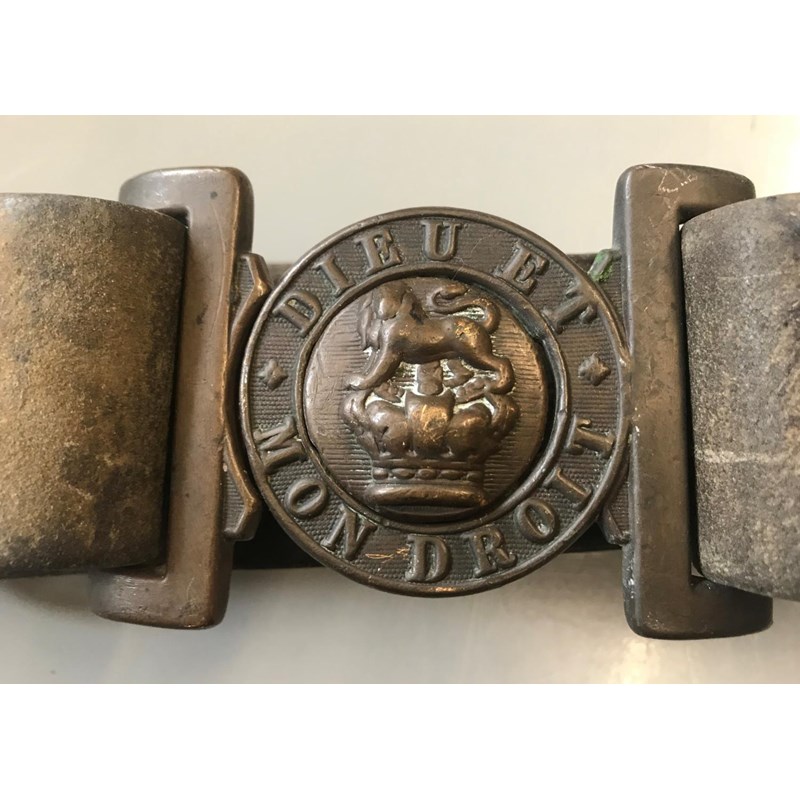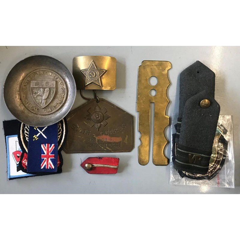 A 2.2cm leather belt with 'Dieu Et Mon Droit' buckle, stamped 3MF 72, with three buckles for straps, a pair of pilots goggles, a Scots Guards bed plate named to T. Jennings 2692544, a Russian belt buckle, a dish commemorating Admiral Charner, and other items.