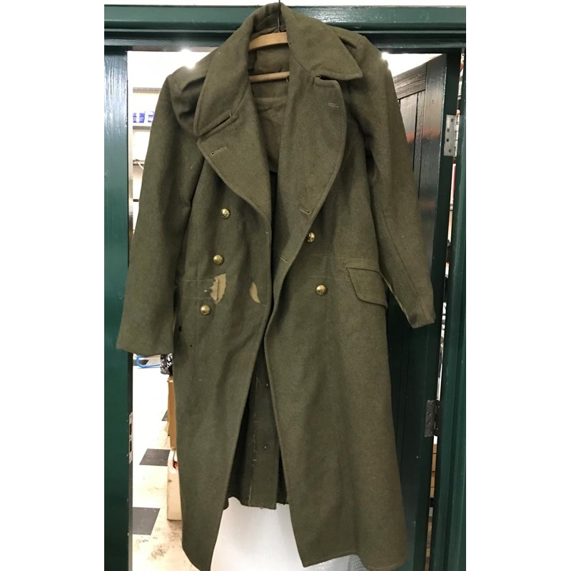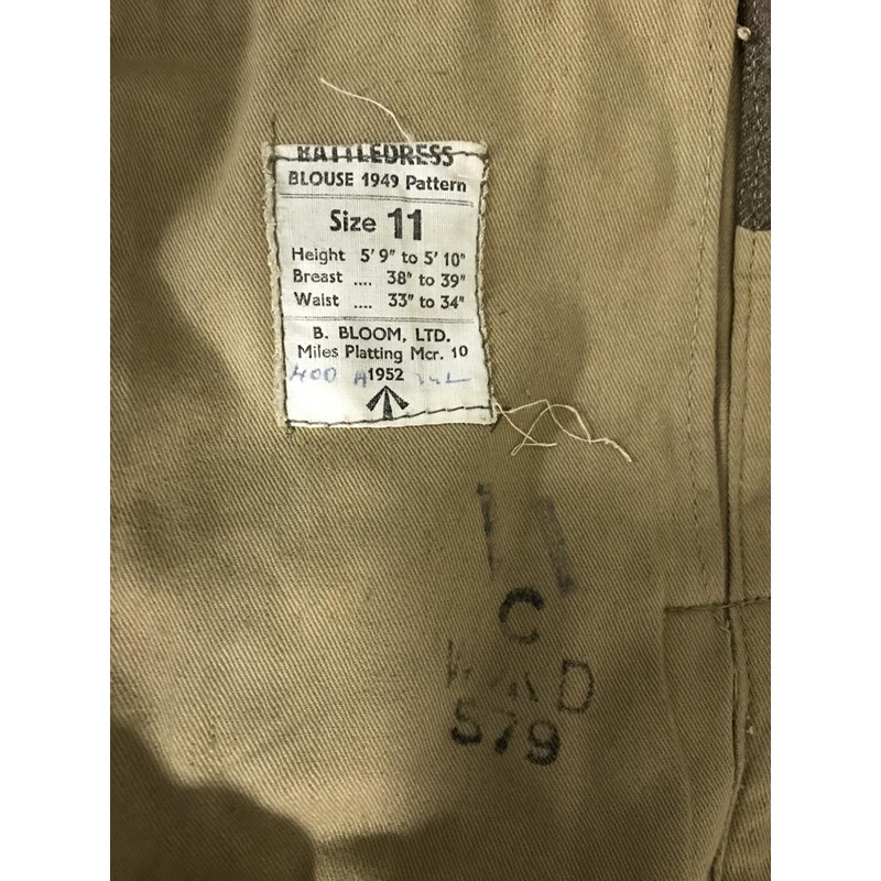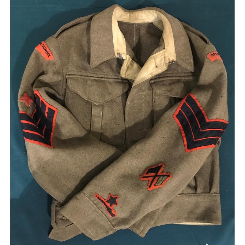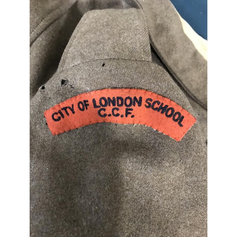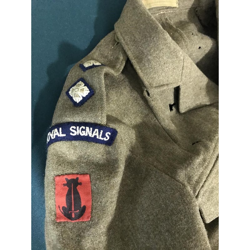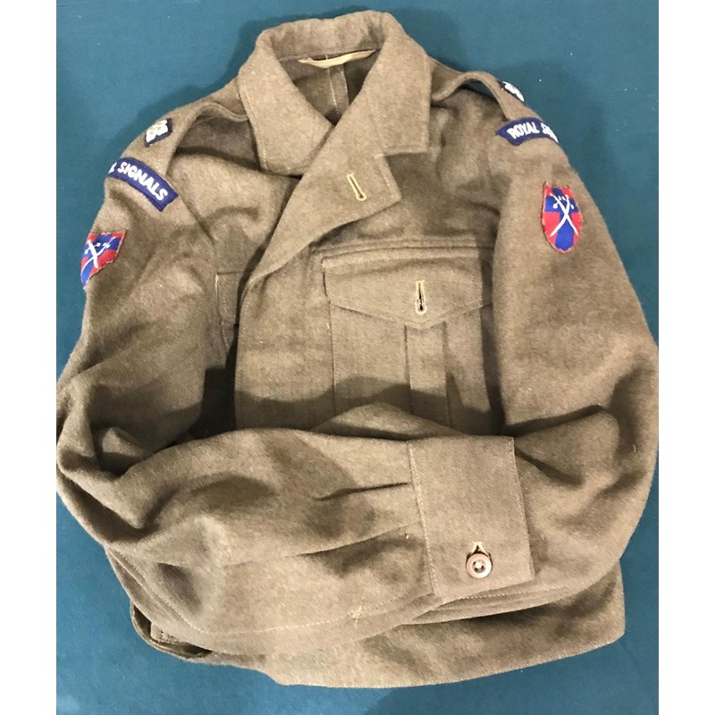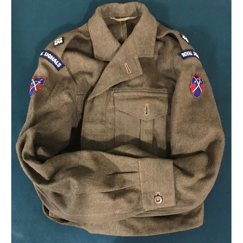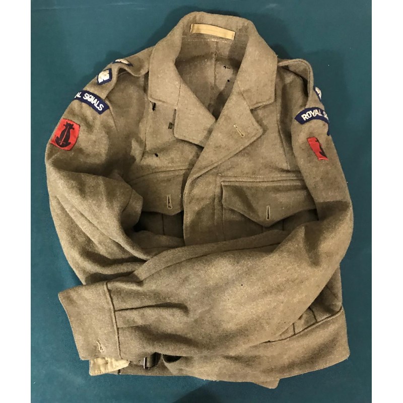 The uniform of National Service Officer Lieutenant Maurice Hanssen of the Royal Corps of Signals, Territorial Division, who had a seniority date of 28th January 1954. Comprising a Battledress blouse 1949 pattern, size 11 dated 1952 with Lieutenants rank, Royal Signals shoulder patches and London Infantry Division formation patch. A similar jacket with 21st Army Group patch. A City of London Schools CCF blouse, two pairs of trousers and a Greatcoat with Royal Signals buttons. All with moth damage.