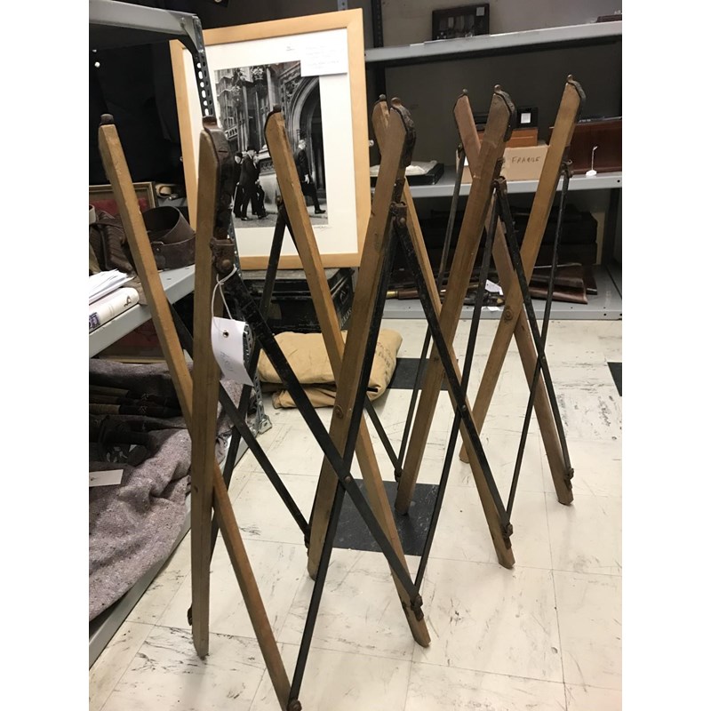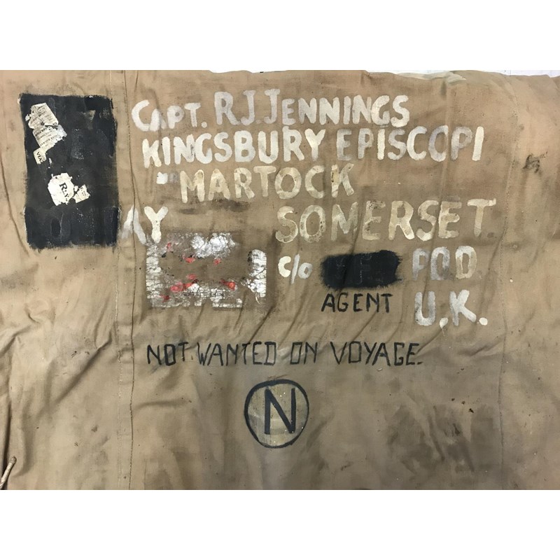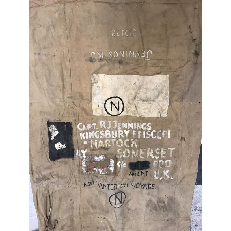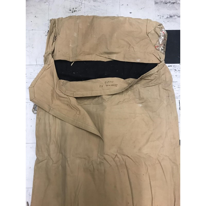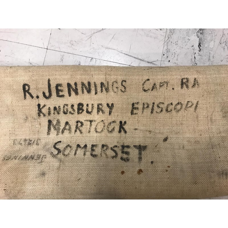 A SELECTION OF KIT USED BY CAPTAIN R.J.JENNINGS QODY AND RA. A selection of uniform and kit used and worn by R.J. Jennings during the second World War comprising a folding bed on concertina base, sleeping bag, folding fabric storage bin by Waring and Gillow with government arrow and dated 1943, and a leather saw cover stamped B.SUB RFA. Many pieces with markings for Capt R.J. Jennings Kinsbury Episcopi, Martock. A lot.