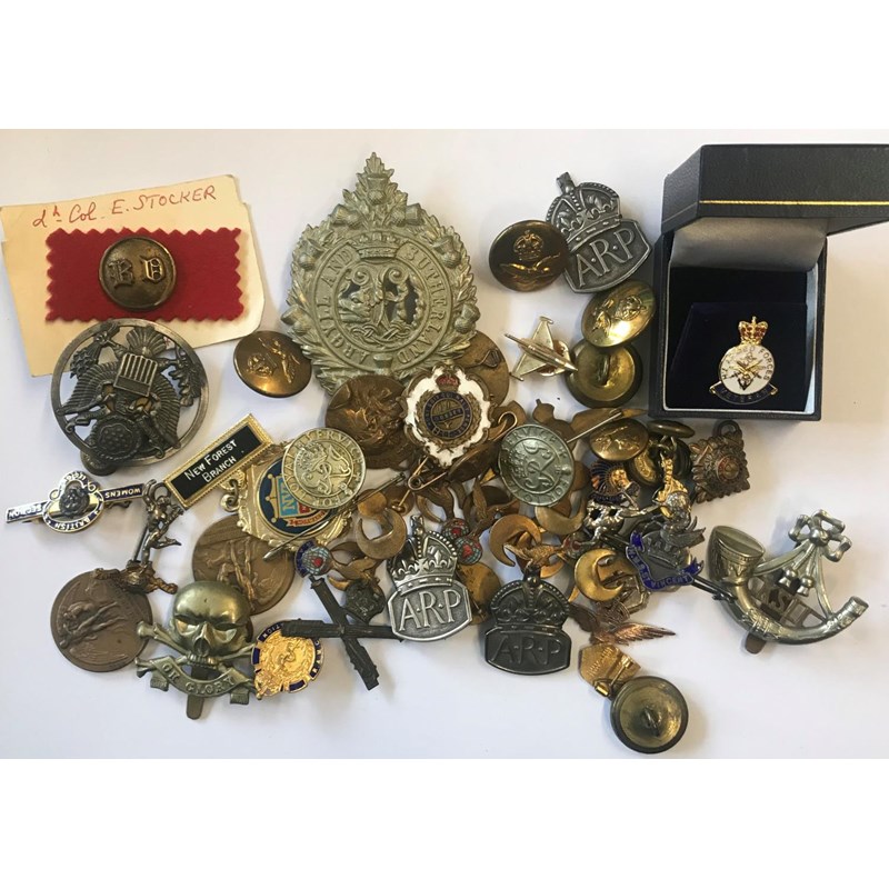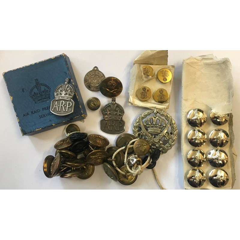 An Argyll and Sutherland Highlanders cap badge, a similar Shropshire Light Infantry badge, six silver ARP badges, one in blue cardboard case of issue, buttons to include RAF and parachute Regiment, and a modern HM Armed Forces Veteran's badge.