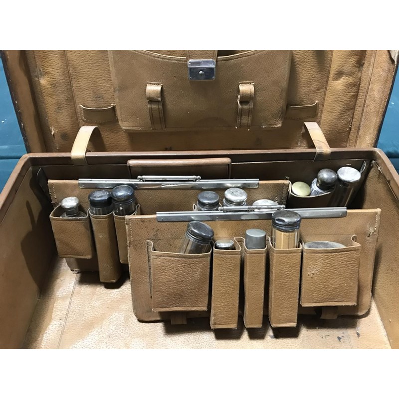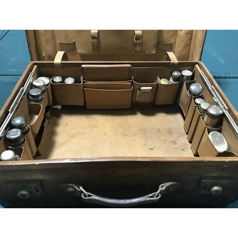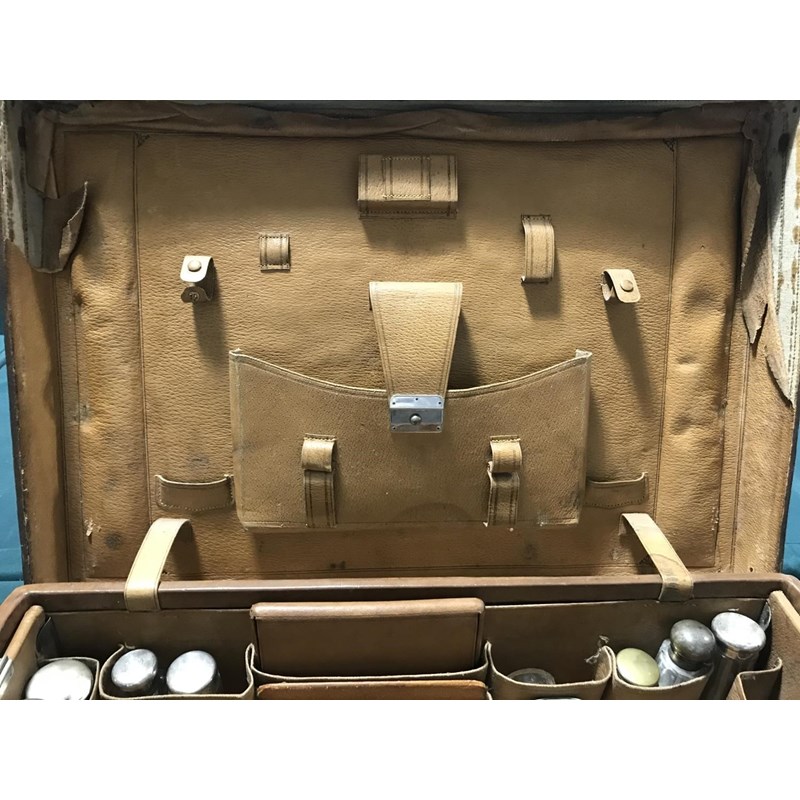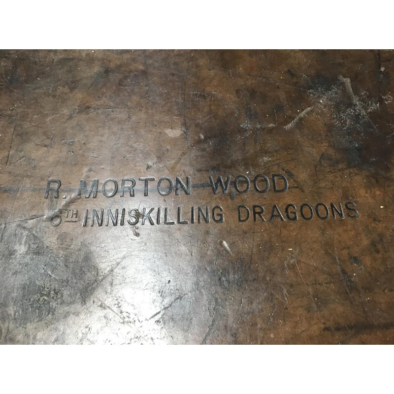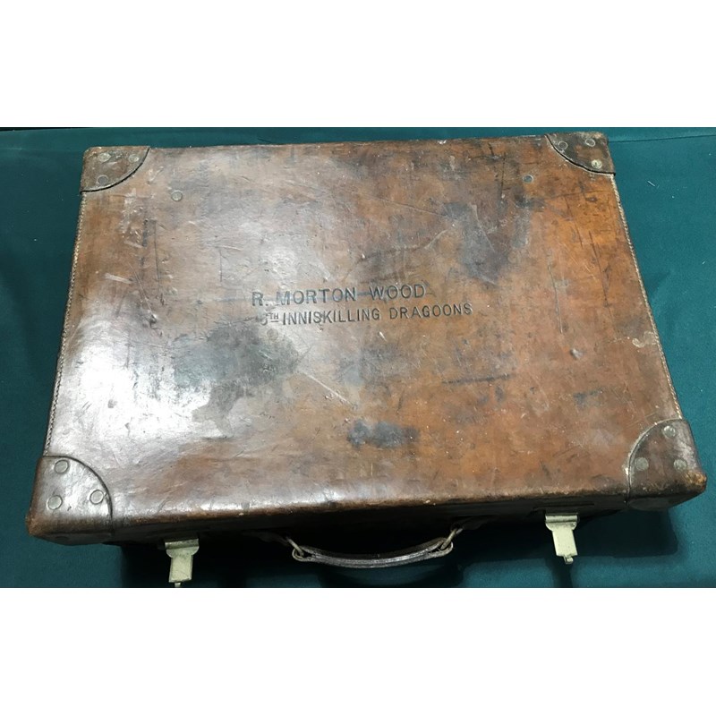 A TRAVELLING CASE BELONGING TO R. MORTON WOOD OF THE 6TH INNISKILLINGS. A fitted leather suitcase, the lid marked 'R. Morton Wood 6th Inniskilling Dragoons', a well made brown leather case fitted with an array of lidded jars, mirrors and other accessories. Presumably this is Richard Morton Wood 16th July 1875 - 6th January 1908 who enlisted for the 6th Inniskillling Dragoons on the 13th October 1900 and probably saw action in South Africa being promoted to Lieutenant in March of 1902.